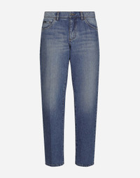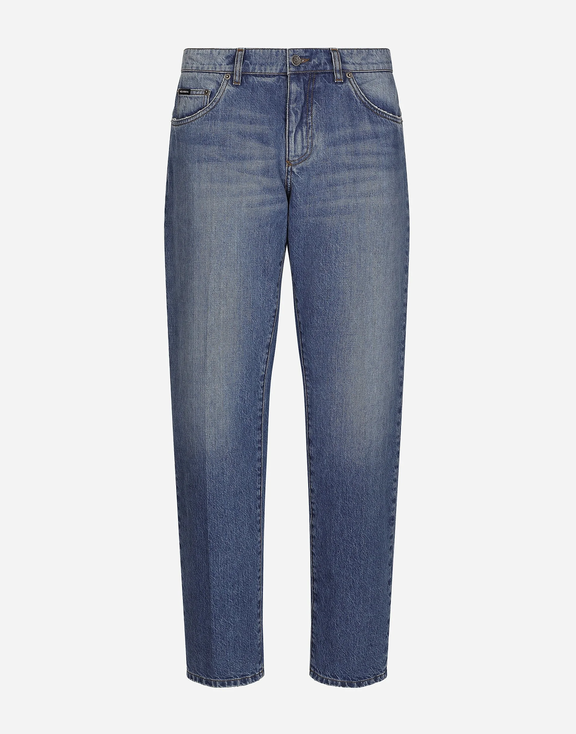 The Palermo collection represents the link between the Sicilian man’s world and the unspoiled nature of the island. A language marked by warm hues – sand, cream, Nero Sicilia black – floral paintings and iconic prints. The Dolce&Gabbana closet must-haves have been reworked in different materials, in pursuit of a new form of harmony. A collection rich in suggestion, such as the stripes inspired by the old mattresses of the 1940s and 1950s, and the timeless aesthetic of the looks. Classic five-pocket cotton denim jeans: • Blue • Regular fit • Fly-covered zipper and button fastening • Metal Dolce&Gabbana logo tag on the back • The item measures 110 cm on the outer leg and the hem is 21 cm wide on a size IT 48 • Made in Italy External composition: 100% Cotton