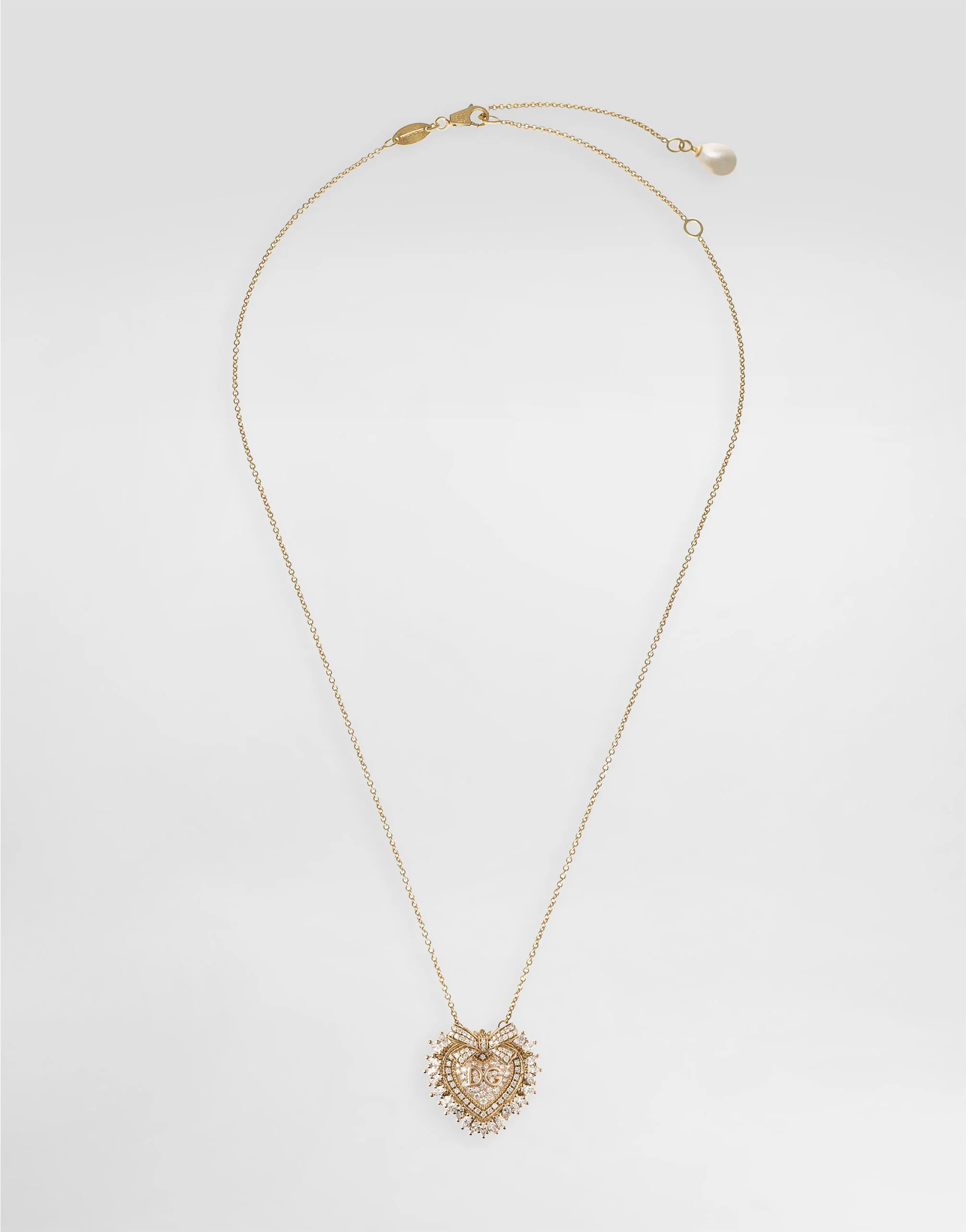 Discover timeless elegance with this exclusive 18 kt yellow gold necklace. The delicate "belcher" chain supports a refined pendant composed of three elements that harmoniously follow one another: an elegant bow embellished with diamonds, a magnificent Sacred Heart framed by diamonds and enriched with 23 marquise-cut diamonds, symbol of unconditional love and eternal faith, and, at the base, a drop pearl. The DG Logo is engraved inside the heart. Technical features: Yellow gold 18Kt. Gems: 106 round diamonds, brilliant cut approximately 0.45 ct; VVS-VS; color: D-G 23 marquise-shaped diamonds, modified brilliant cut; approximately 0.70 ct; VVS-VS; color: D-G 1 oval white-cream freshwater pearl approximately 2.40 ct Made in Italy Yellow gold 750/000