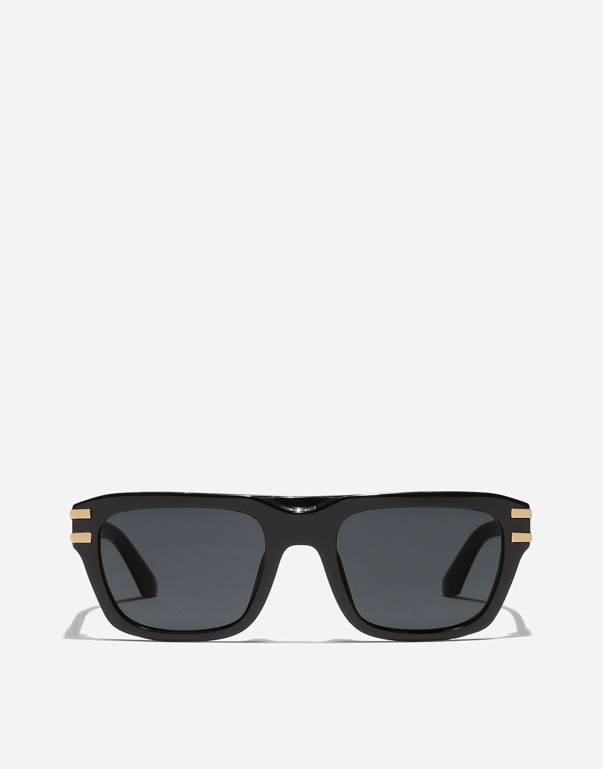 Acetate rectangular model with exclusive metal details on the front; DG crossed logo embellishes the bold temples. • Black acetate frame • Black acetate temples • Dark grey lenses • 100% UV protection • Size lens - bridge - temple: 54 - 21 - 145 mm • Fitting: Standard • Packaging: Institutional • Made in Italy
