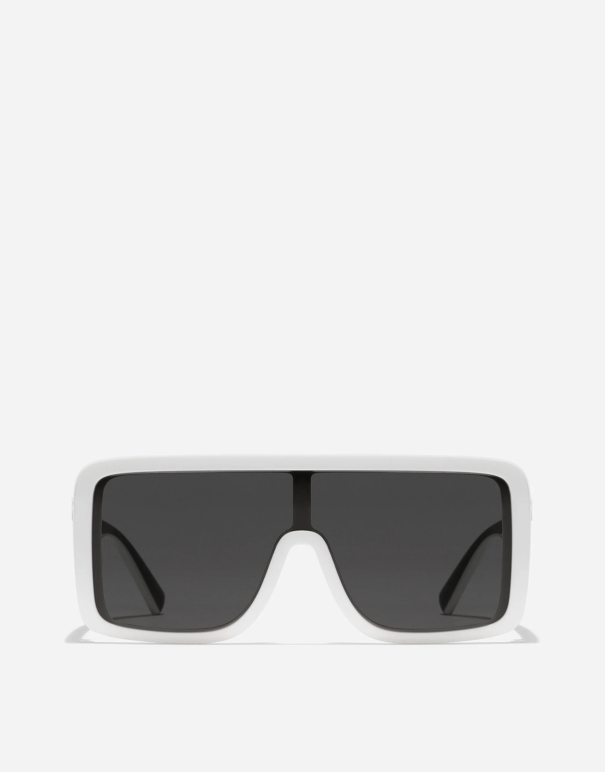 This bold shield frame showcases a dynamic sporty aesthetic, crafted with advanced bi-injection techniques that blend nylon fiber and rubber details for enhanced texture and durability. All the sku’s are adorned with a rubber DG logo on the front. • White on black nylon fiber frame • White on black nylon fiber temples •Dark grey lenses •100% UV protection • Size bridge - temple - lens: x - 145 - x mm • Fitting: Standard • Packaging: Institutional • Made in Italy