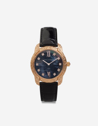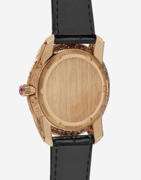 • Material. 18 Kt pink gold hand engraved • Size. 34 mm diameter • Glass. convex “sapphire” glass • Crown. screwed down, hand engraved and set with 1 natural ruby Dial • Black mother-of-pearl - Markers. pink gold-plated • Gemstones. 10 colourless diamonds Movement • Electronic quartz movement powered by a 1.5 V, 3 years life battery. • Calibre. ETA E01.001 Swiss Made • Size. 11 mm diameter, h 2.5 mm • Frequency of the quartz. 32,768 Hz • Number of rubies. 3 Strap. black alligator • Clasp. hand engraved pin buckle in 18 Kt pink gold •Swiss Made Add your personal touch to this item such as your initials or a customized message. Send the request to CustomerServiceJewelleryWatches@dolcegabbana.it. If the item has been customized then it cannot be returned. Red gold 18Kt Indication of hours and minutes Bottom clasp: clip-down with safety closure Side decoration: 18 Kt pink gold hand engraved Water resistance: 3BAR/3ATM Hands: luminescent “baton” hands POST-SELLING WATCHES MAINTENANCE To maintain the sheen of the watch and metal bracelet, we recommend using mild soap and rinsing thoroughly with warm water. Dry with a soft cloth. We recommend this being done also after a swim in the sea or pool. It is advisable to avoid direct contact with solvents, detergents, perfumes and cosmetic products, which might damage the case, seals, bracelet and/or strap. It is advisable to protect the watch from falls and shocks, which could not only seriously damage the finish, but might affect the mechanical functions also, as well as the water resistance and accuracy of the watch. Temperatures above 60° C and below -10° C , sudden changes in pressure, density and temperature, magnetic fields, and many other factors can affect the accuracy of the watch. If you note any irregularities in operation, the watch should be taken to an authorised Dolce&Gabbana retailer. The Dolce&Gabbana watch is a high-precision timepiece. Despite the care watchmakers have dedicated to making it, the influence of magnetic fields, sudden temperature change and even the lifestyle of the wearer may result in minor irregularities. To ensure optimal operation, it is recommended that a comprehensive inspection be effected every three or four years. The owners of the watch can benefit from a global network of Dolce&Gabbana retailers, which alone are authorised to carry out operations on the watch. In the same way, for the electronic quartz movement, it is recommended that the battery be replaced by an authorised Dolce&Gabbana retailer, which will at the same time check the proper functioning and water resistance of the watch. During maintenance, the battery and any electrical parts are collected and disposed of in accordance with current regulations.