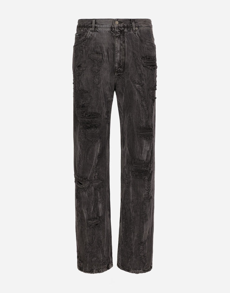 Oversize five-pocket high-waisted wide-leg jeans in washed denim with rips and abrasions: • Loose fit • Fly-covered zipper and button fastening • Metal Dolce&Gabbana logo tag on the back • Gray • The item measures 115 cm on the outer leg and the hem is 26 cm wide on a size IT 48 • The model is 185 cm tall and wears a size IT 48 • Made in Italy Care And Details External composition: 100% Cotton