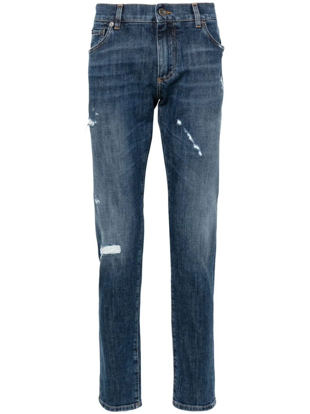 ripped-detail tapered jeans Highlights - Indigo blue - Stretch-cotton - Washed denim - Ripped detailing - Silver-tone logo plaque - Mid-rise - Belt loops - Front button and zip fastening - Classic five pockets - Tapered leg - Slim cut Made in Italy Composition Cotton 98%, Elastane 2% SIZE & FIT Model measurements Height 6 ft 2 in(1.87 m) Bust/Chest 36.22 in(92 cm) Hips 37 in(94 cm) Waist 27.95 in(71 cm) FittingInformation Designed for a slim fit, these jeans offer a comfortable fit that sits just away from the leg Constructed from stretch denim, this piece offers a stretch fit with durability This piece fits true to size – take your usual size