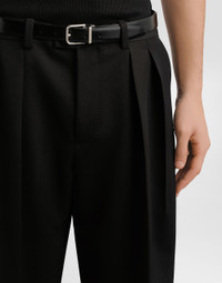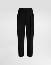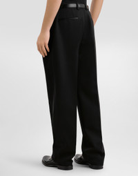 The scene is set for Dolce&Gabbana's distinctive and iconic aesthetic codes in the Collection from Men's Fall/Winter 2025 Fashion Show. The evening lights up with radiant brooches and is enriched with classic suits and blazers of timeless elegance. These elegant wool gabardine trousers are the perfect choice for a sophisticated and modern look, ideal for any occasion. Wool gabardine trousers: • Black • Folds towards the center front • Wide hem • The model is 185 cm tall and wears a size 48 IT • Made in Italy External Composition: 100% Wool
