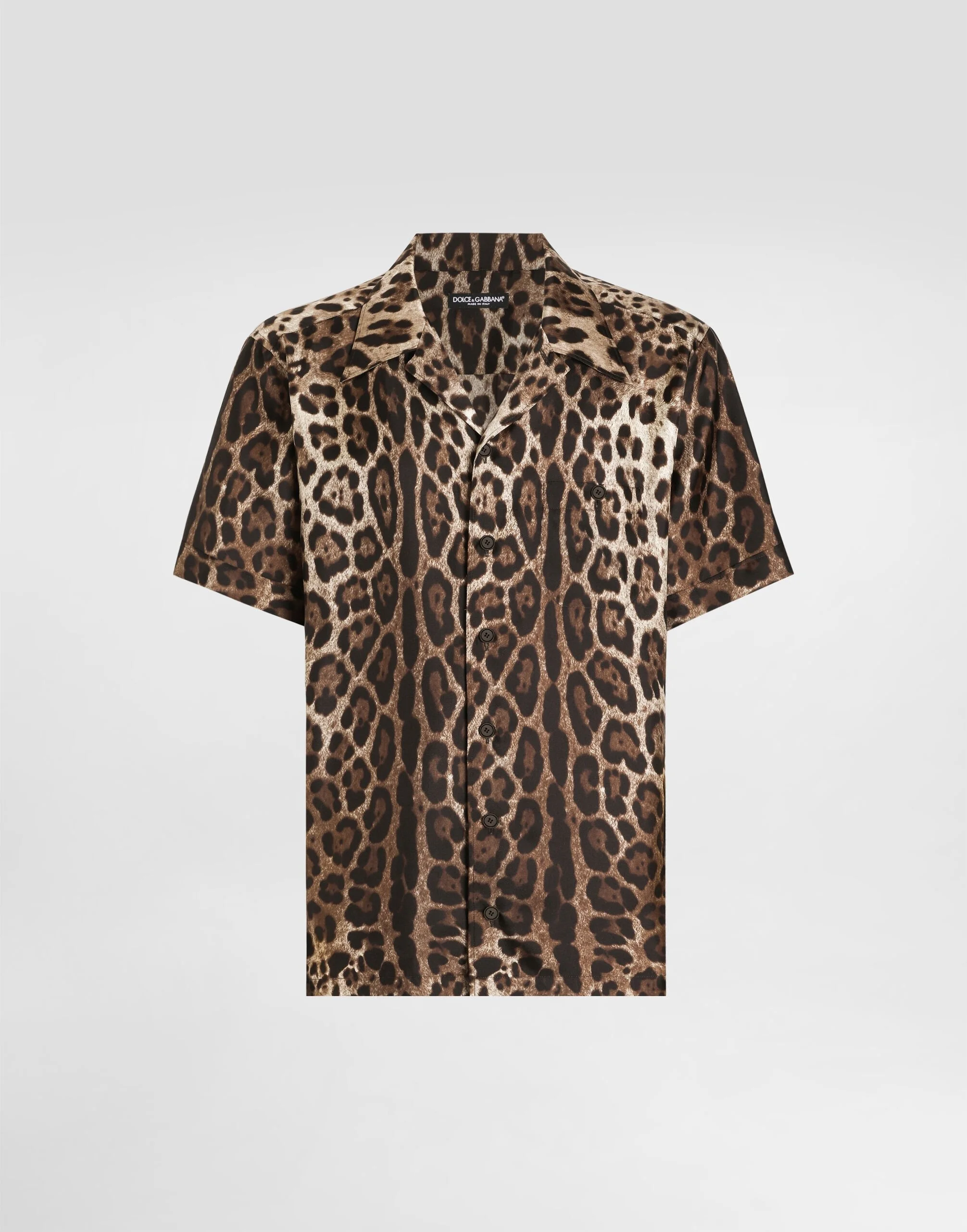 The DNA Men's Collection reimagines daily wear with bold contrasts, meticulous details, and innovative silhouettes. Outerwear stands out with clean lines and high-tech materials, merging sportiness with sophistication in sweaters, sweatshirts, and trousers. A striking color palette, including Black Sicily, caramel, cream, burgundy, and stone gray, pairs with iconic prints like Leopard and Polka dots, enhancing the collection's authentic and refined look. Silk twill Hawaiian shirt with leopard print: • Leopard print • Regular fit • Hawaiian collar • Short sleeves • Button fastenings and breast pocket • The piece measures 78 cm from the rear collar seam on a size IT 40 • Made in Italy The difference in the print placement that you may find on this product is a feature of Dolce&Gabbana’s “Handmade” pieces. A detail that makes every garment or accessory unique and exclusive. External composition: 100% Silk
