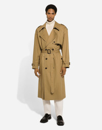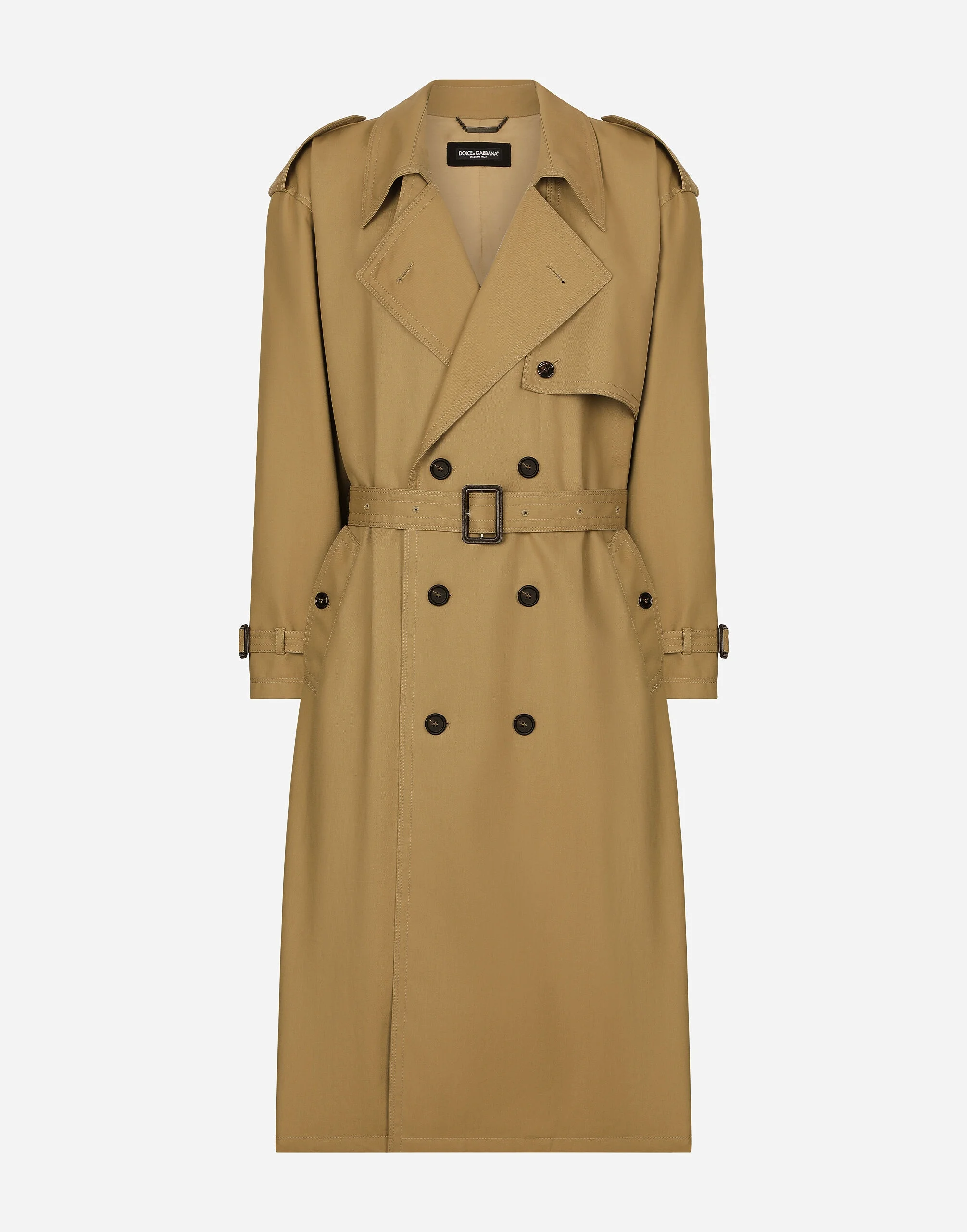 In the “Sartoriale” collection, iconic Italian sartorial heritage is presented from a new perspective, made up of lines, silhouettes and details, concealed buttoning, geometric lapels, and jackets that have seen their proportions completely overhauled. The tale is a journey embarked upon to discover a new kind of tailoring that is perfect in terms of fit, with meticulous attention to detail, that strives to speak and represent the style of the wearer, through small - yet significant - details that will make every piece unique. Double-breasted cotton trench coat: • Beige • Regular fit • Buttons and belt on the front • Outer buttoned pockets and zipped welt pockets on interior • Strap and buckle on the cuff • Central rear vent • Lined • The piece measures 124 cm from the rear collar seam on a size IT 48 • Made in Italy External composition: 100% Cotton Internal composition: 100% Viscose
