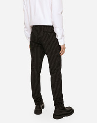 Tailored two-piece suit in pinstripe stretch wool: • Black •Slim Sicilia fit •Jacket with peak lapels, flap pockets and breast pocket, two inner pockets and central vent •Double-breasted fastening with buttons • Lined •Pants with front slant pockets and rear buttoned welt pockets •The jacket measures 73.5 cm from the back collar seam on a size IT 48 •The pants measure 115 cm on the outer leg and the hem is 17.5 cm wide on a size IT 48 •The model is 185 cm tall and wears a size IT 48 •Made in Italy Care And Details External composition: 97% Virgin Wool 3% Spandex Internal composition: 100% Silk