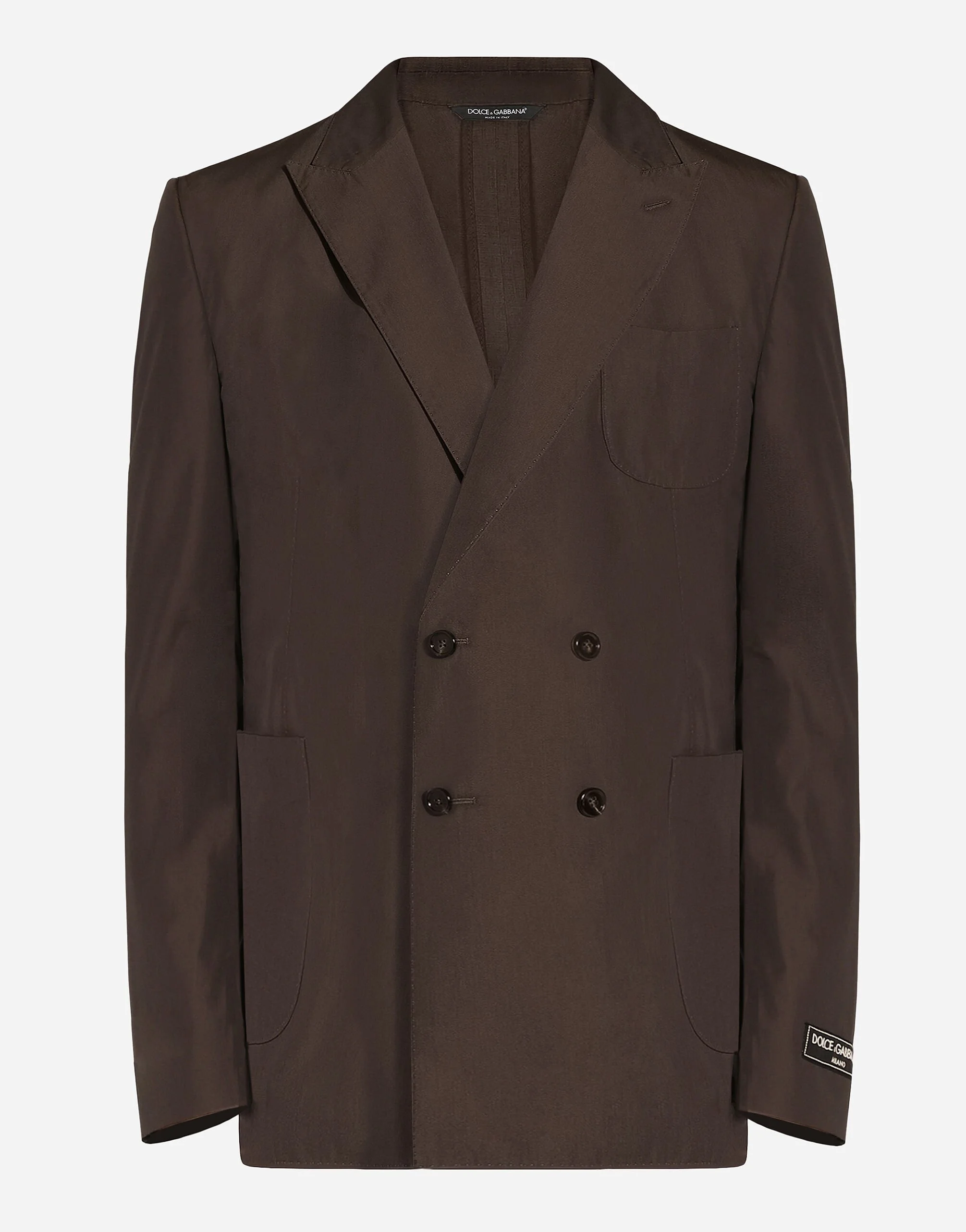 The Palermo collection represents the link between the Sicilian man’s world and the unspoiled nature of the island. A language marked by warm hues - sand, cream, Nero Sicilia black - floral paintings and iconic prints.The Dolce&Gabbana closet must-haves have been reworked in different materials, in pursuit of a new form of harmony. A collection rich in suggestion, such as the stripes inspired by the old mattresses of the 1940s and 1950s, and the timeless aesthetic of the looks. Tailored double-breasted unlined jacket in cotton poplin: • Brown • Regular Portofino fit • Peak lapels • Button fastenings on the front • Outer patch pockets and welt pockets on the interior • Buttoned cuffs • Central vent • Lined sleeves • The piece measures 73 cm from the rear collar seam on a size IT 48 • Made in Italy External composition: 81% Cotton 19% Silk Internal composition: 81% Cotton 19% Silk