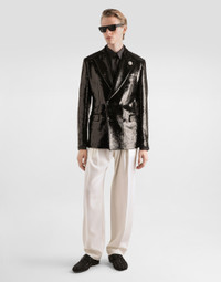 This double-breasted jacket is an iconic piece that combines elegance and modernity. Perfect for those who want to stand out in style, it is ideal for special occasions or glamorous evenings. Double-breasted jacket with sequins: • Black • Sicilia Light shape • Rounded lapels • With buttons • Fused and lined • Center back length 73.5 cm on size 48 IT • The model is 185 cm tall and wears a size 48 IT • Made in Italy External Composition: 99% Polyester, 1% Silk Internal Composition: 92% Silk, 8% Elastane