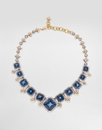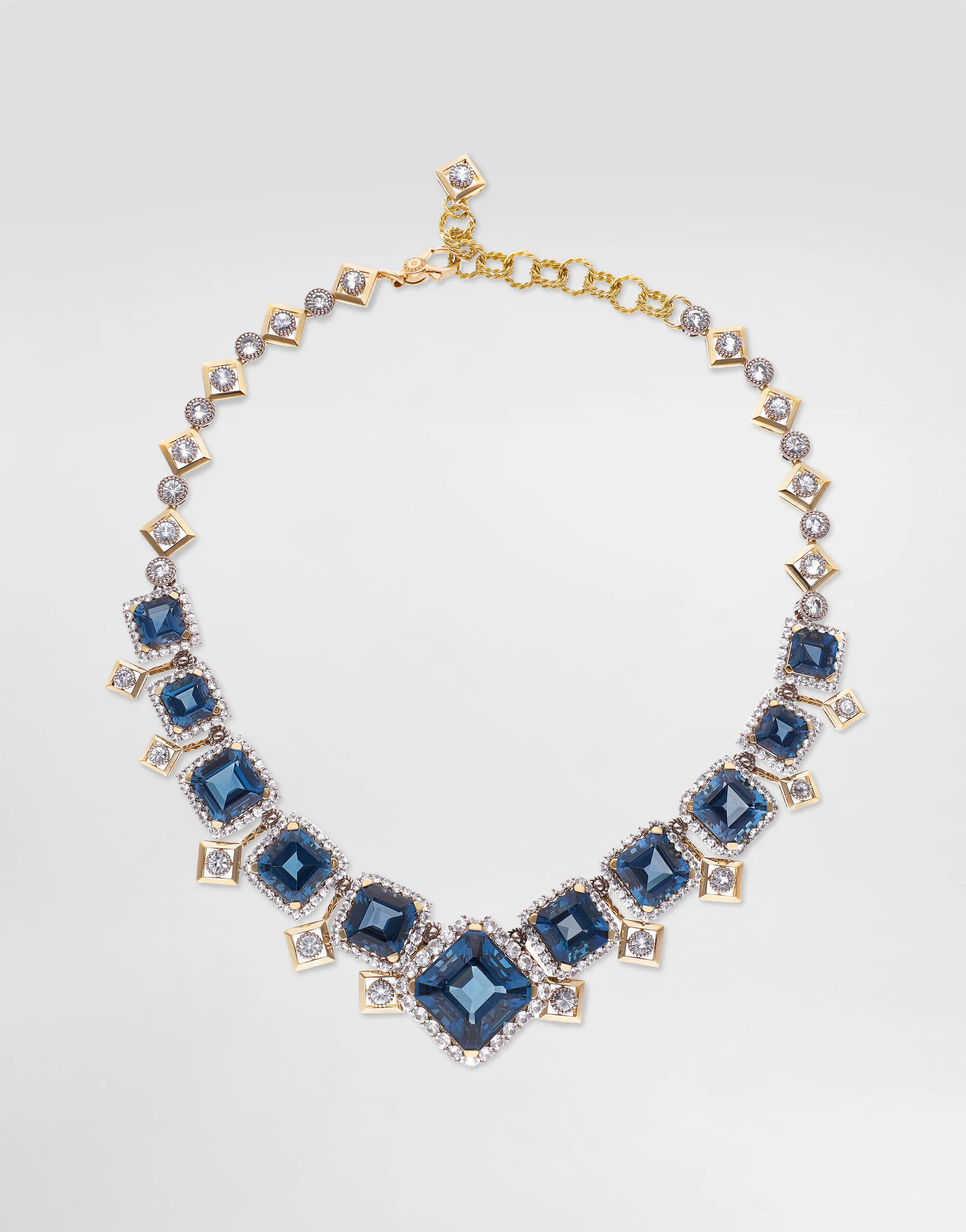 A refined necklace made of 18 Kt white and yellow gold, embellished with intense London Blue topazes and luminous colorless sapphires. The balance between the deep shades of blue and the crystalline brilliance of the sapphires creates an elegant and harmonious contrast, enhancing the beauty of the design. On the back, a tag with the Dolce&Gabbana logo adds a distinctive touch, a seal of authenticity and style. Gemological Details: 11 "London" topazes: blue color, square shape with rounded corners, step cut; 278 sapphires: colorless, round shape, brilliant cut. Made In Italy White and yellow gold 750/000