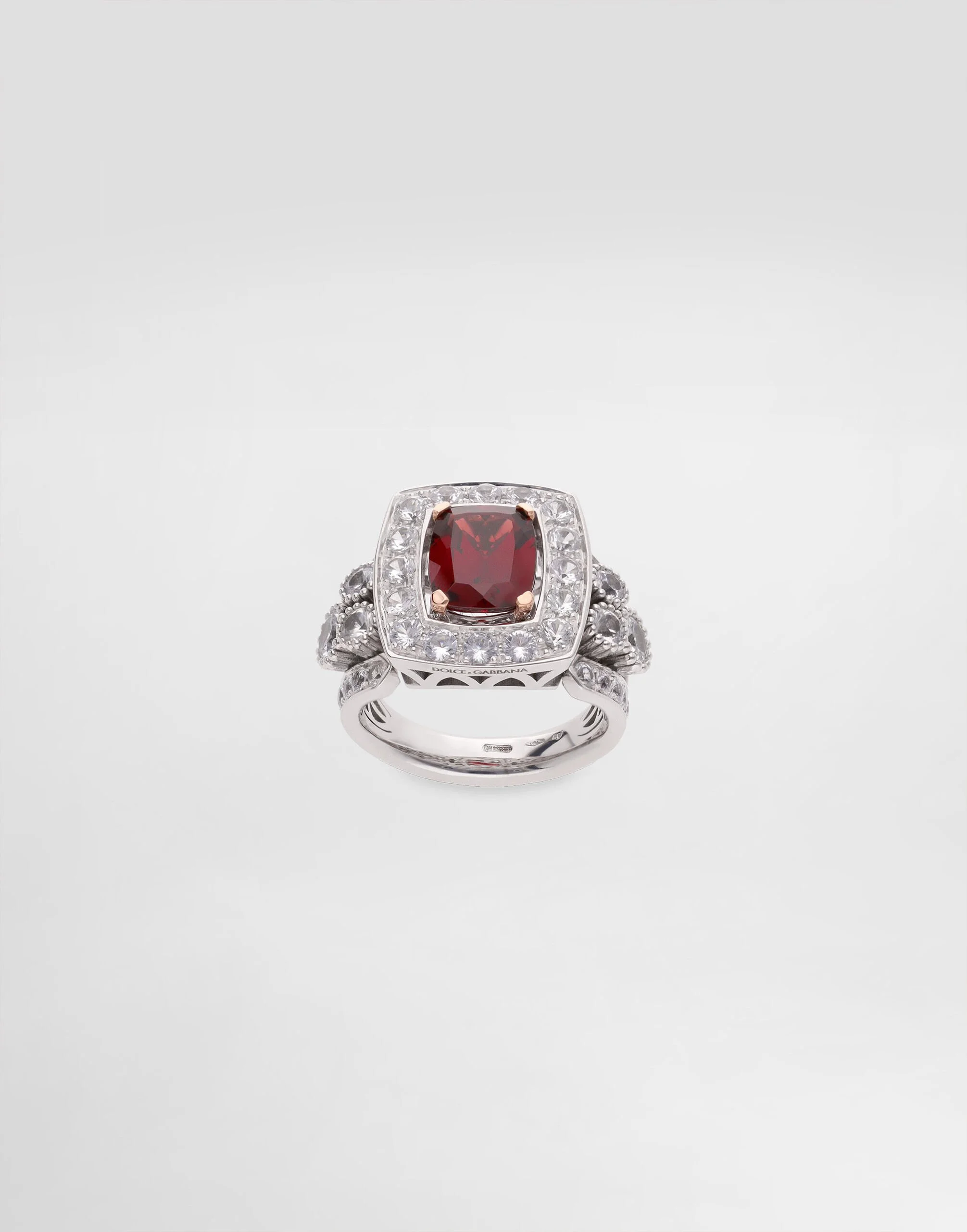 Elegant ring made of white and rose gold, embellished with a central rhodolite garnet, with intense shades, framed by bright colorless sapphires that enhance its brilliance and refined design. On the back, a tag with the Dolce&Gabbana logo adds a distinctive touch, a seal of authenticity and style. Gemological Details: 1 rhodolite garnet: red color, rectangular cushion shape, mixed cut; 48 sapphires: colorless, round shape, brilliant cut. Made in Italy White and rose gold 750/000