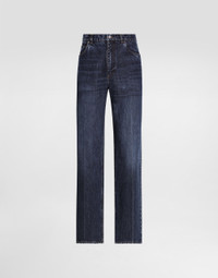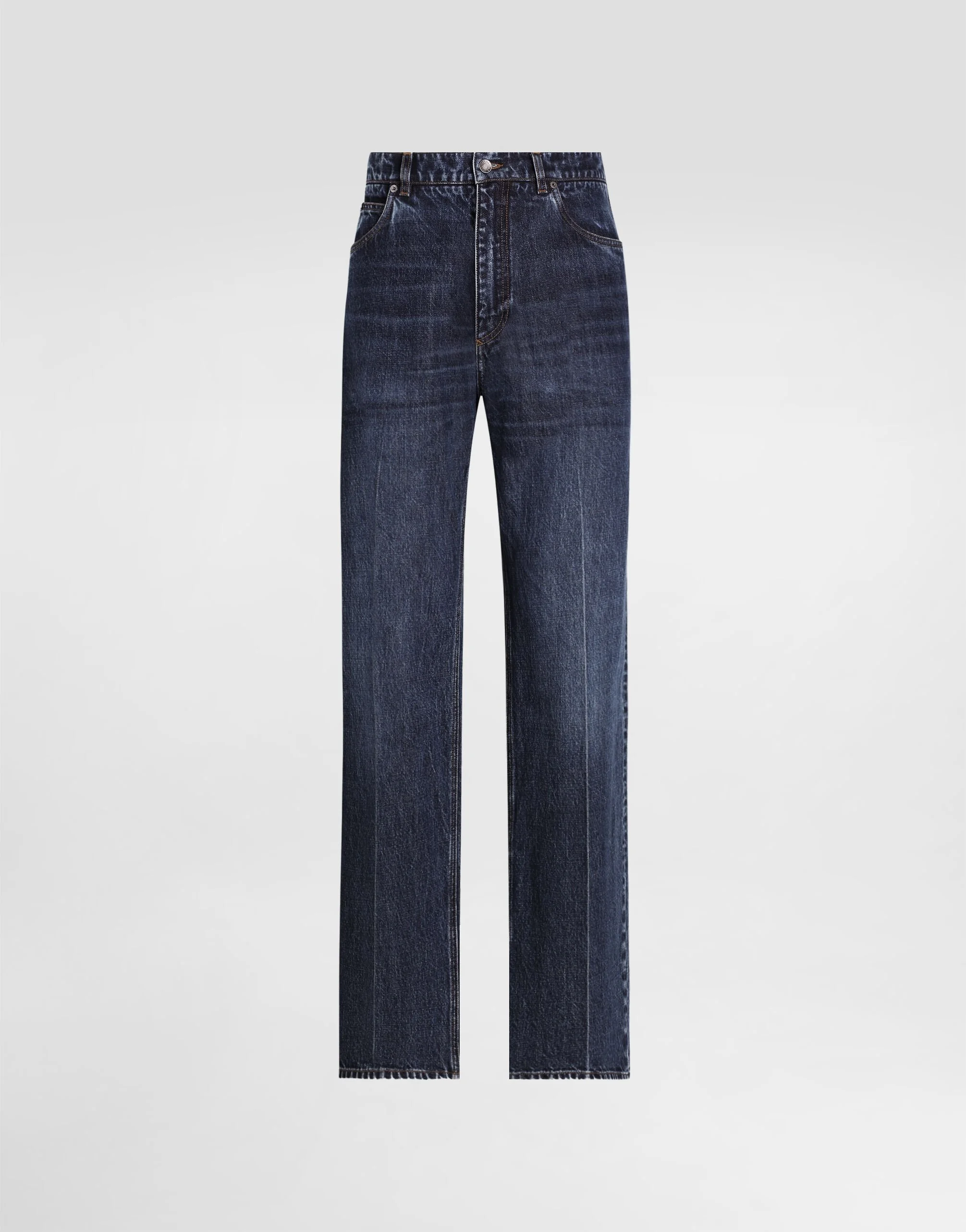 The Italian Holiday Men's Collection revisits 1950s style with a blend of relaxed fits and modern flair. Classic white shirts and tailored suits in refined fabrics contrast with casual denim and playful T-shirts featuring retro graphics with a futuristic twist. Bold prints—chessboards, cats, elegant lighters, and Mediterranean blue ribbons—alongside logo jacquard inspired by ties, infuse a contemporary edge into the essence of Italian holidays. Oversize five-pocket wide-leg cotton jeans with DG logo embroidery: • Blue • Loose fit • Fly-covered zipper and button fastening • Metal Dolce&Gabbana logo tag on the back • The item measures 115 cm on the outer leg and the hem is 26 cm wide on a size IT 48 • Made in Italy External composition: 100% Cotton