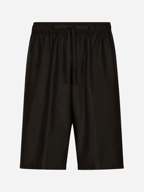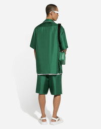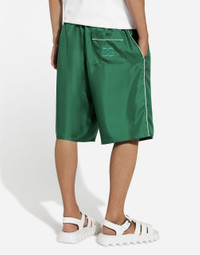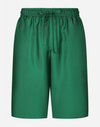 Pictorial, at times volumetric with a textured effect, the decorative “calligraphic-naturalistic” majolica in solid-color green gives life to a collection distinguished by eclectic silhouettes, some stolen from the world of sports, with a cool and light vibe. The vibrant two-tone accenting – green and white – is designed to enhance a series of details, such as the pockets, the green piping paired with the white silk pajamas, the stripes on the polo-shirts, the cuffs on the shirts or the jersey inserts on the T-shirts. Silk twill jogging shorts with back embroidery: • Green • Regular fit • Stretch waistband with drawstring • Front slant pockets and back pocket • Side slits • The item measures 58 cm on the outer leg and the hem is 32 cm wide on a size IT 48 • Made in Italy External composition: 100% Silk