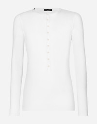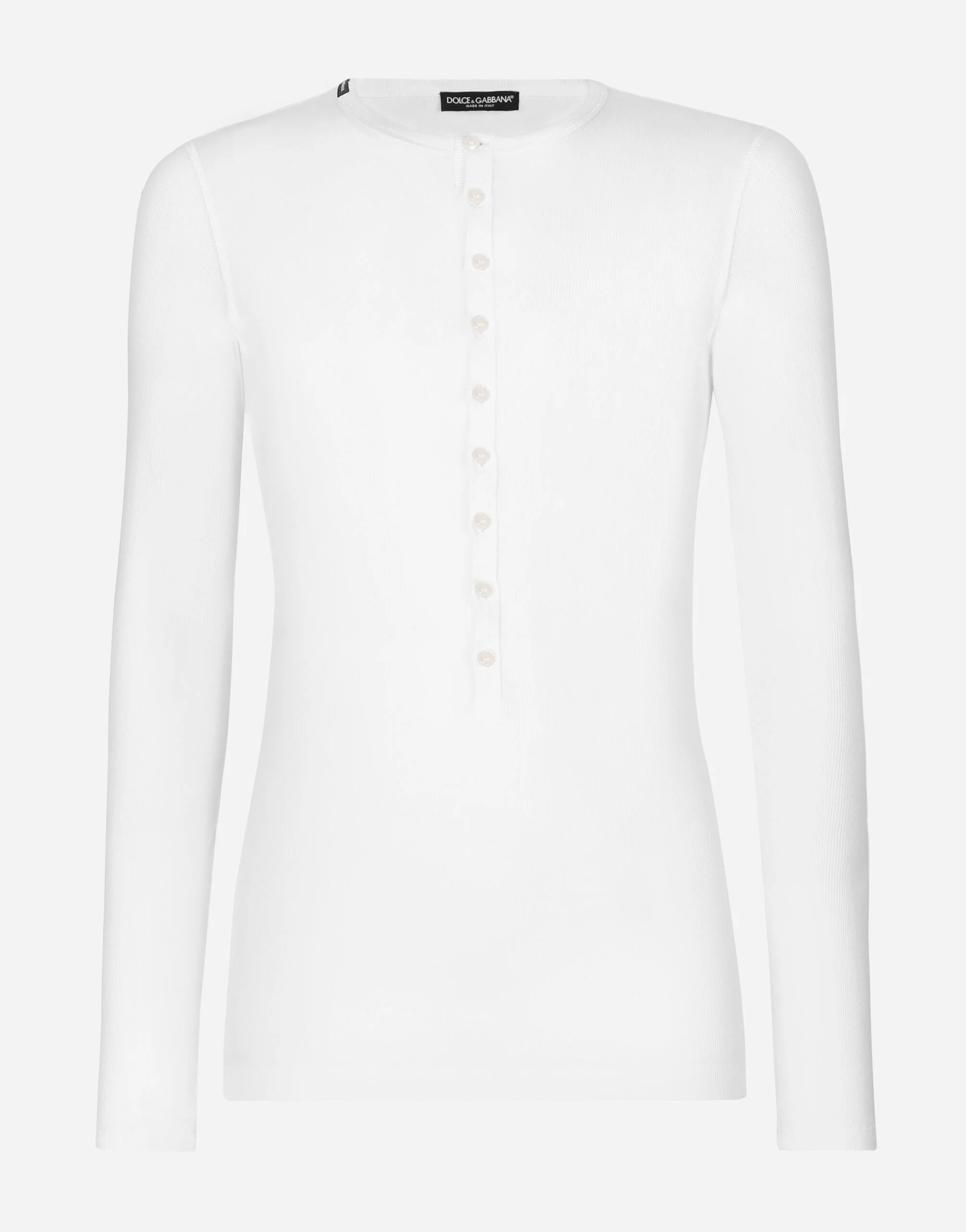 Fine-rib cotton jersey granddad-neck T-shirt: • White • Slim fit • Round neck • Button fastenings • Long sleeves • Dolce&Gabbana logo label • The piece measures 76 cm from the rear collar seam on a size IT 48 • The model is 185 cm tall and wears a size IT 48 • Made in Italy Care And Details External composition: 100% Cotton