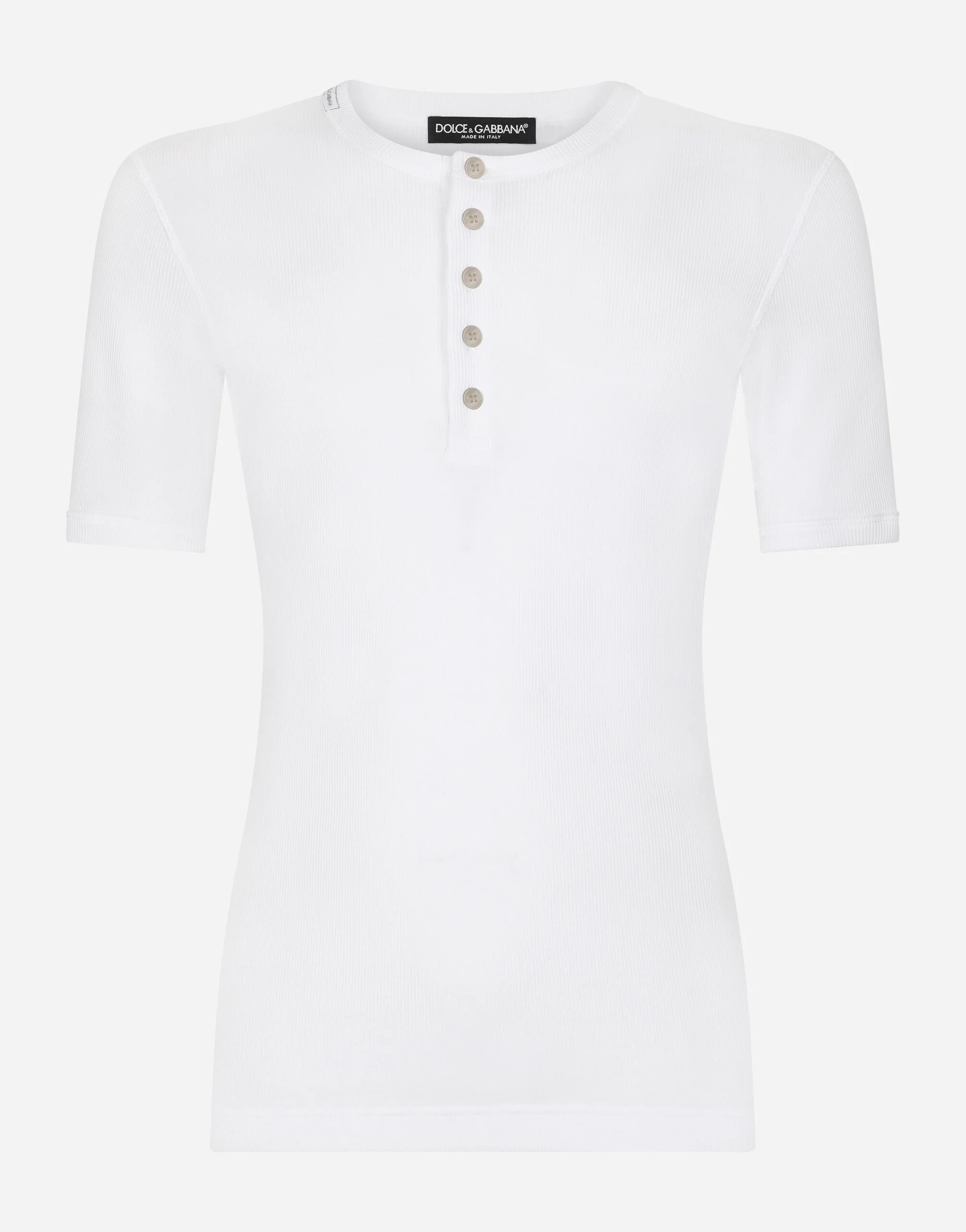 Fine-rib cotton jersey granddad-neck T-shirt: • Slim fit • Round neck • Button fastenings • Short sleeves • Dolce&Gabbana logo label • Black • The piece measures 74 cm from the rear collar seam on a size IT 48 • The model is 185 cm tall and wears a size IT 48 • Made in Italy Care And Details External composition: 100% Cotton