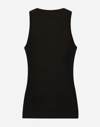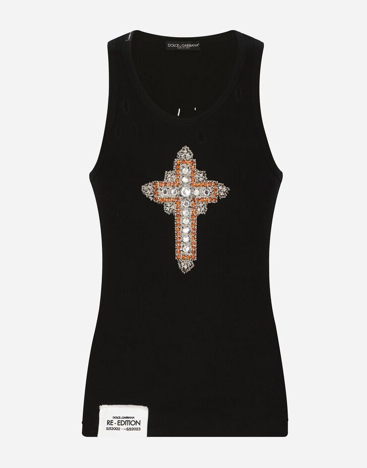 Fine-rib wide-shouldered singlet in washed cotton jersey with rips, a crystal patch and the Re-Edition label: • Slim fit • Round neck • Fabric label with Dolce&Gabbana logo • The piece measures 74 cm from the rear collar seam on a size IT 48 • The model is 185 cm tall and wears a size IT 48 • Made in Italy Care And Details External composition: 100% Cotton