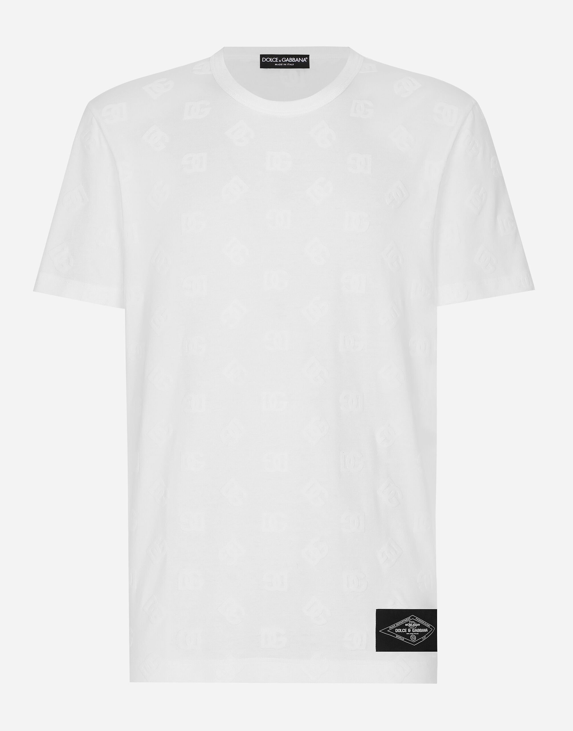 The men's FW 24-25 Re-Edition collection conveys contemporary style that flaunts all the power of the creative DNA that consolidated the brand's image and elevated it to iconic status in the 2000s. Raw-cut details and skilled finishes distinguish pieces with streetwear character: military-inspired jackets and maxi-coats, multi-pocket cargo pants and picot pieces alternate with denim boasting many washes and dyes, thereby redefining an iconic style that is always evolving. Cotton jersey T-shirt with all-over flocked DG logo: • Black • Regular fit • Stretch knit round neck • Short sleeves • The piece measures 72 cm from the rear collar seam on a size IT 48 • Made in Italy External composition: 100% Cotton