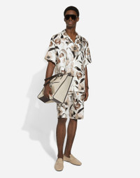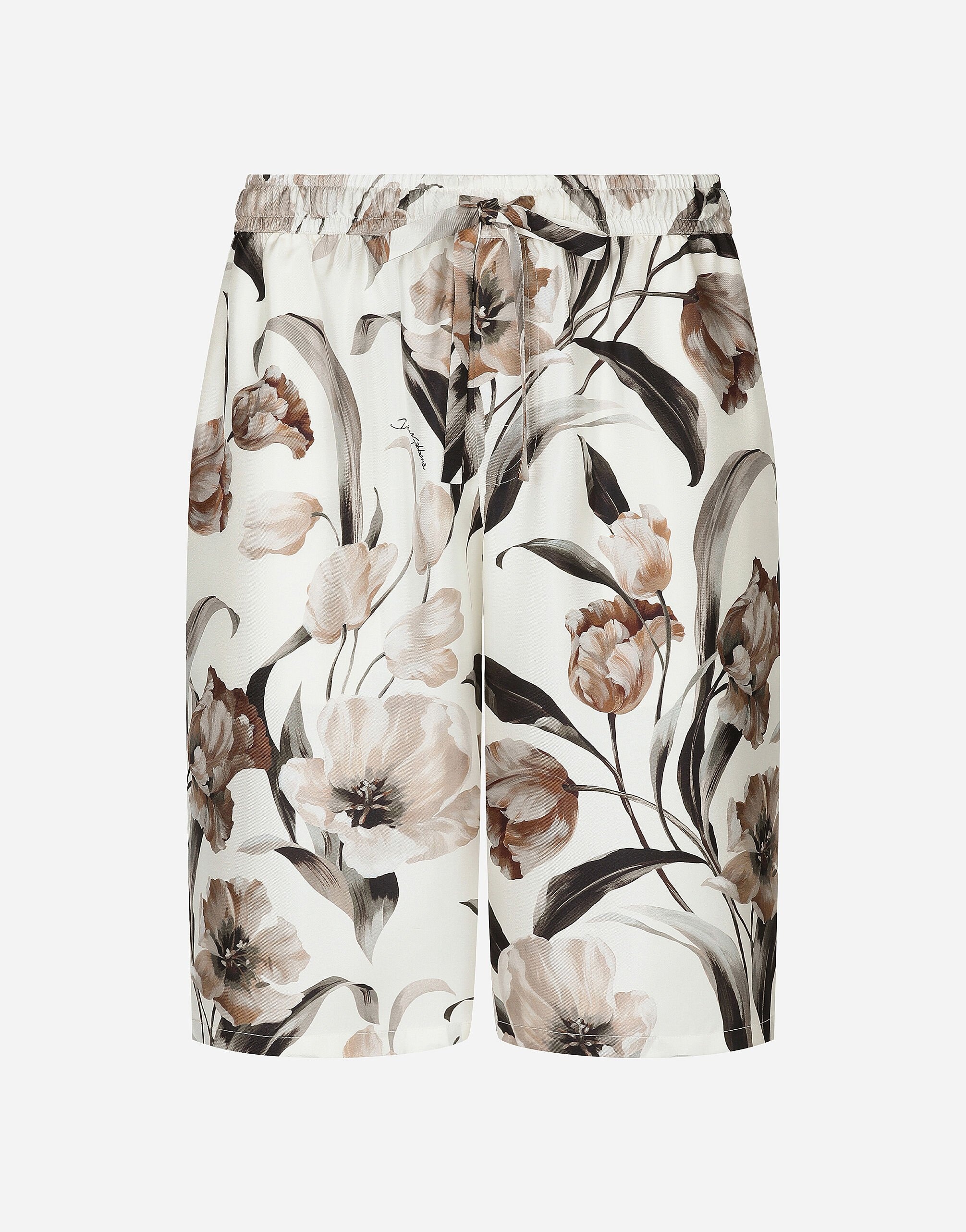 The Palermo collection represents the link between the Sicilian man’s world and the unspoiled nature of the island. A language marked by warm hues – sand, cream, Nero Sicilia black – floral paintings and iconic prints. The Dolce&Gabbana closet must-haves have been reworked in different materials, in pursuit of a new form of harmony. A collection rich in suggestion, such as the stripes inspired by the old mattresses of the 1940s and 1950s, and the timeless aesthetic of the looks. Floral-print silk twill jogging shorts: • White • Regular fit • Stretch waistband with drawstring • Front slant pockets and buttoned patch pocket at the back • Side slits • The item measures 58 cm on the outer leg and the hem is 32 cm wide on a size IT 48 • Made in Italy The difference in the print placement that you may find on this product is a feature of Dolce&Gabbana’s “Handmade” pieces. A detail that makes every garment or accessory unique and exclusive. External composition: 100% Silk