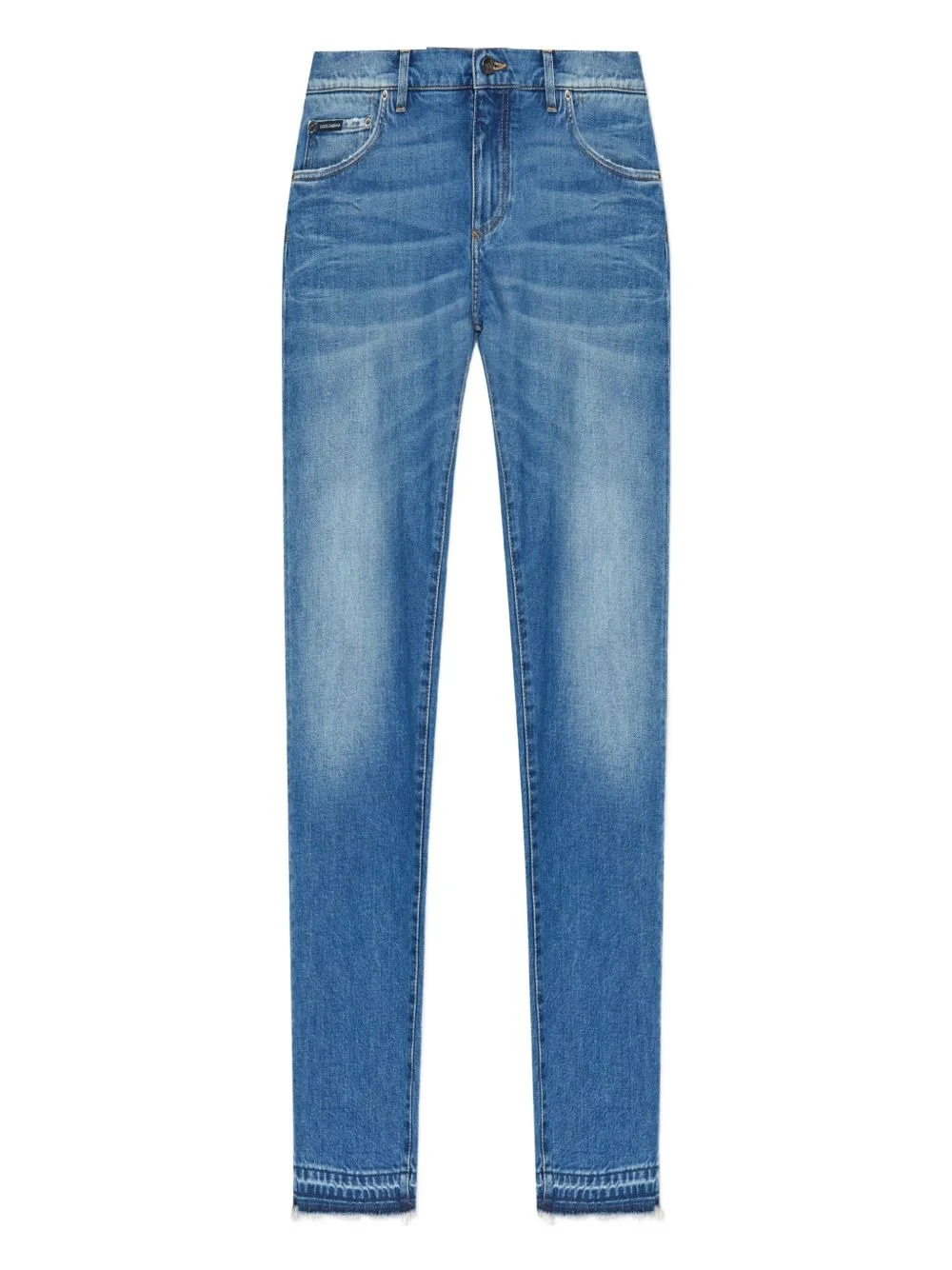 frayed-hem jeans Highlights - Blue - Frayed hem - Five-pocket styling - Button fly - Leather logo patch - Mid-rise waist Made in Italy Composition Cotton 99%, Elastane 1% Washing instructions Read Manufacturer Guidelines
