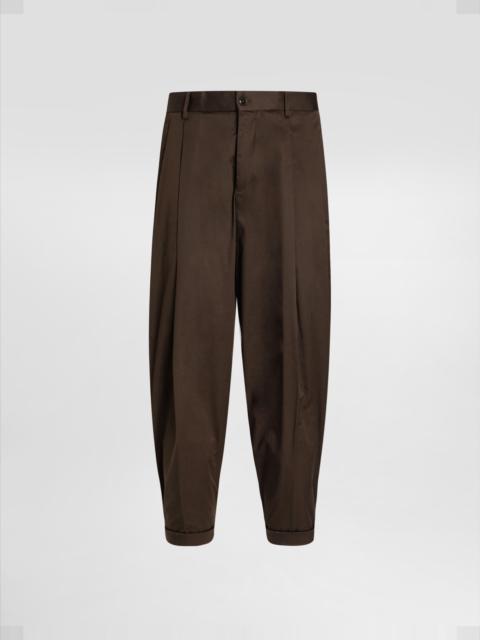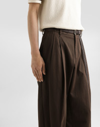 Italy and its beauty are reflected in the Men’s SS25 Collection. Woven raffia and leather give life to jackets, polo-shirts and sweaters to celebrating Italian craftsmanship. The color palette ranges from Nero Sicilia black to burgundy, contributing to conveying a sense of eternal elegance. Refined accessories complement the look: belts and loafers with hand-finished details and oversize bags, such as the Sicily, the Marlene with crocodile-effect print and the versatile Adamo tote. Stretch cotton gabardine pants with double darts: • Brown • Regular fit • Belt loops on the waist • Fly-covered zipper and button fastening • Front slant pockets and buttoned welt pockets at the back • The item measures 100 cm on the outer leg and the hem is 18 cm wide on a size IT 48 • Made in Italy External composition: 97% Cotton 3% Spandex