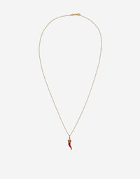 Necklace comprises a yellow gold "belcher" chain and a pendant in the shape of a horn, a superstitious symbol, enamelled in red and adorned with a small crown. An oval plate bearing the "DOLCE&GABBANA" logo has been placed by the closure. Technical specifications • Gold 18 Kt. • Length. 55 + 10 cm adjustable. • Made in Italy Yellow 18 kt Gold