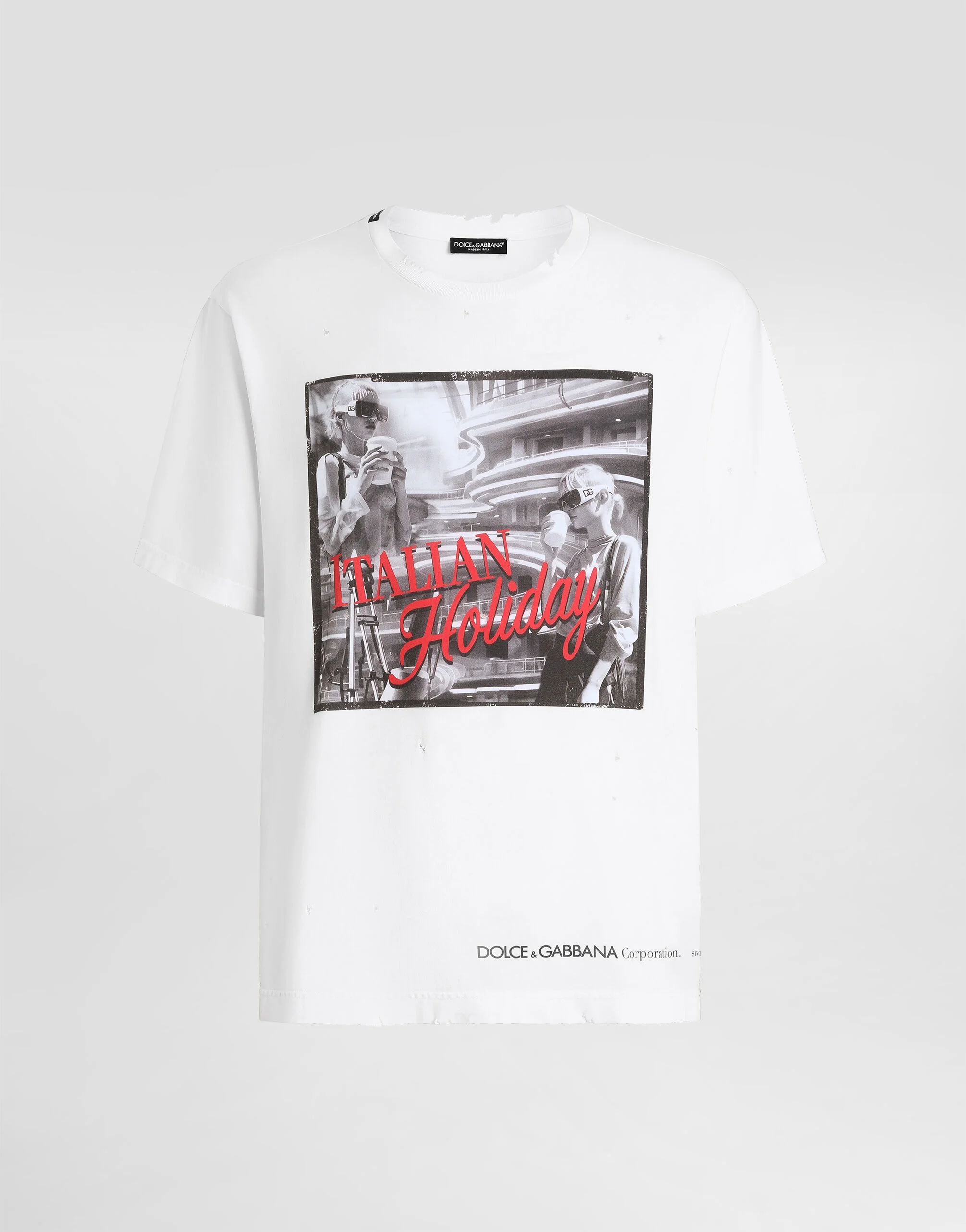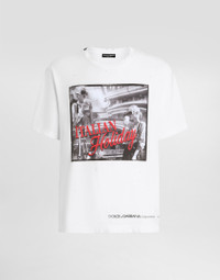 The Italian Holiday Men's Collection revisits 1950s style with a blend of relaxed fits and modern flair. Classic white shirts and tailored suits in refined fabrics contrast with casual denim and playful T-shirts featuring retro graphics with a futuristic twist. Bold prints—chessboards, cats, elegant lighters, and Mediterranean blue ribbons—alongside logo jacquard inspired by ties, infuse a contemporary edge into the essence of Italian holidays. Cotton jersey T-shirt with Italian Holiday print: • White • Regular fit • Short sleeves • The piece measures 73 cm from the shoulder seam on a size IT 48 • Made in Italy The difference in the print placement that you may find on this product is a feature of Dolce&Gabbana’s “Handmade” pieces. A detail that makes every garment or accessory unique and exclusive. External composition: 100% Cotton