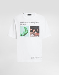 The Italian Holiday Men's Collection revisits 1950s style with a blend of relaxed fits and modern flair. Classic white shirts and tailored suits in refined fabrics contrast with casual denim and playful T-shirts featuring retro graphics with a futuristic twist. Bold prints—chessboards, cats, elegant lighters, and Mediterranean blue ribbons—alongside logo jacquard inspired by ties, infuse a contemporary edge into the essence of Italian holidays. Cotton jersey T-shirt with hand and coffee print: • White • Regular fit • Short sleeves • The piece measures 73 cm from the shoulder seam on a size IT 48 • Made in Italy The difference in the print placement that you may find on this product is a feature of Dolce&Gabbana’s “Handmade” pieces. A detail that makes every garment or accessory unique and exclusive. External composition: 100% Cotton