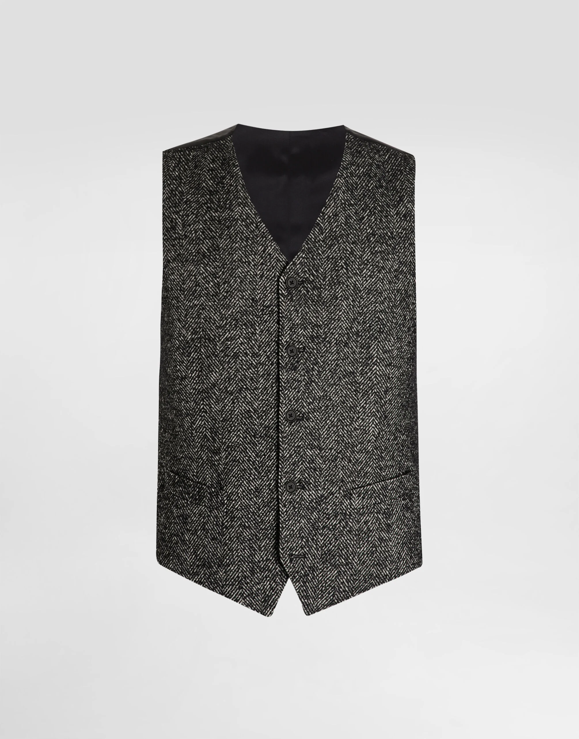 The scene is set for Dolce&Gabbana's distinctive and iconic aesthetic codes in the Collection from Men's Fall/Winter 2025 Fashion Show. The evening lights up with radiant brooches and is enriched with classic suits and blazers of timeless elegance. This vest is a stylish and versatile piece that is perfect for completing a formal look or adding a touch of class to a casual outfit. Wool chevron single-breasted vest: • Multi-colored • No lapel • With buttons • Welt pocket • Lined • The model is 185 cm tall and wears a size 48 IT • Made in Italy External Composition: 47% Silk, 32% Wool, 18% Wool, 2% Polyamide, 1% Elastane