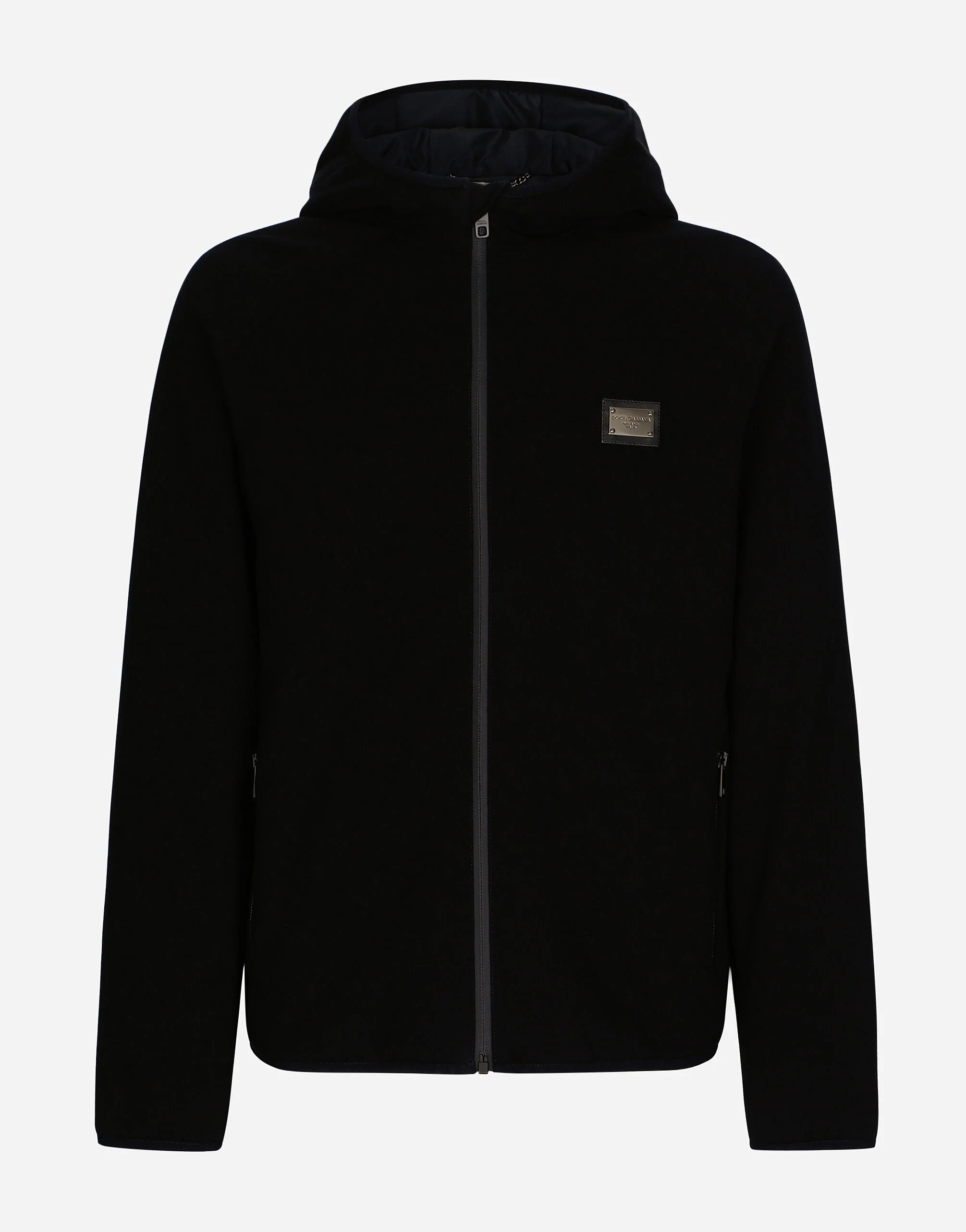 Quilted technical stretch jersey jacket with metal tag featuring the Dolce&Gabbana logo: •Black •Light insulated padding on the interior •Regular fit •Hood with stretch tape •Front zipper fastening •Raglan sleeves •Outer welt pockets with zipper and inner welt pockets with button •Lined •The piece measures 68 cm from the rear collar seam on a size IT 48 •The model is 185 cm tall and wears a size IT 48 •Made in Italy Care And Details External composition: 69% Viscose 25% Polyamide 6% Spandex Internal composition: 100% Polyester