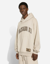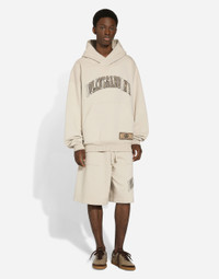 The Palermo collection represents the link between the Sicilian man’s world and the unspoiled nature of the island. A language marked by warm hues – sand, cream, Nero Sicilia black – floral paintings and iconic prints. The Dolce&Gabbana closet must-haves have been reworked in different materials, in pursuit of a new form of harmony. A collection rich in suggestion, such as the stripes inspired by the old mattresses of the 1940s and 1950s, and the timeless aesthetic of the looks. Cotton jersey hoodie with Dolce&Gabbana logo embroidery: • Beige • Oversize fit • Front pouch pocket with label • Stretch knit hem and cuffs • The piece measures 73.5 cm from the rear collar seam on a size XL • Made in Italy External composition: 100% Cotton Internal composition: 100% Cotton