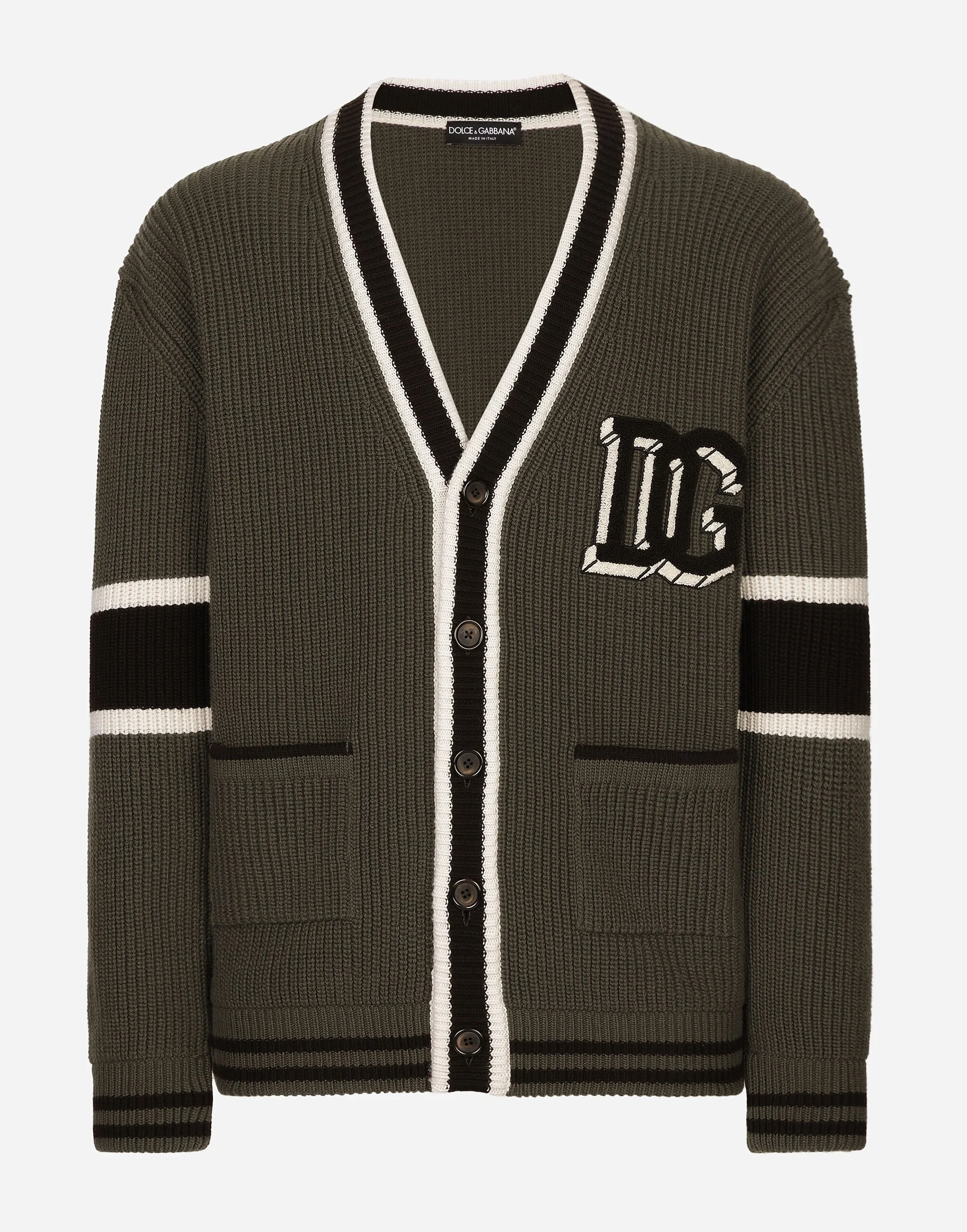 The men's FW 24-25 Re-Edition collection conveys contemporary style that flaunts all the power of the creative DNA that consolidated the brand's image and elevated it to iconic status in the 2000s. Raw-cut details and skilled finishes distinguish pieces with streetwear character: military-inspired jackets and maxi-coats, multi-pocket cargo pants and picot pieces alternate with denim boasting many washes and dyes, thereby redefining an iconic style that is always evolving. Fisherman's rib V-neck cardigan in virgin wool with contrasting-colored trims and DG logo patch: • Green • Oversize fit • Front pockets • Button fastenings • 5-gauge knit • The piece measures 71 cm from the shoulder seam on a size M • Made in Italy External composition: 100% Virgin Wool