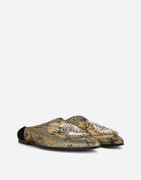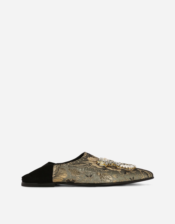 Jacquard slippers with crystal embellishment: • Jacquard upper with brooch embellishment • Calfskin insole with quilted satin insert and branded label • Branded leather sole • Made in Italy Care And Details External composition: 25% Polyester 20% Calfskin 20% Acrylic 19% Wool 16% Metal Internal composition: 45% Lambskin 45% Calfskin 10% Goatskin