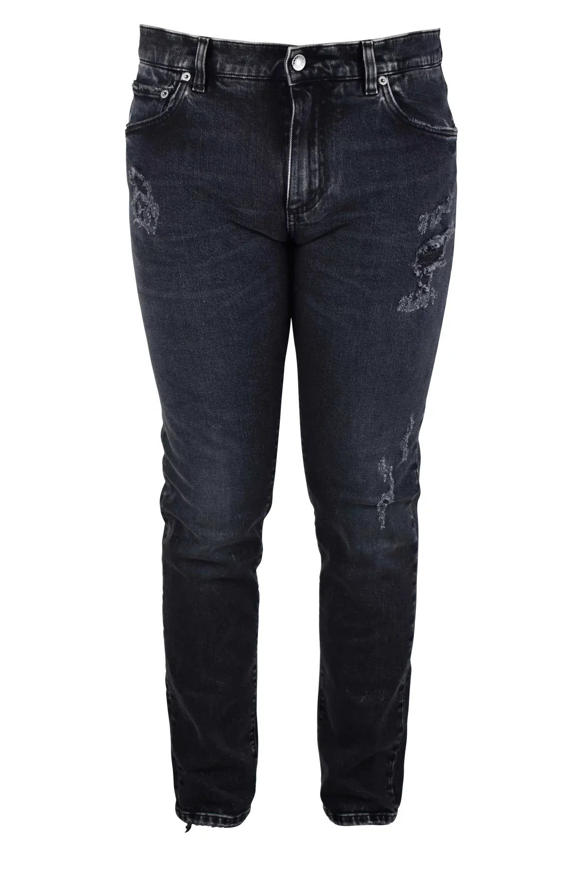 Dolce & Gabbana black jeans. Faded effect and small tears at front. Silver logo plaque at back. 100% cotton. Made in Italy.