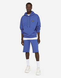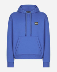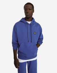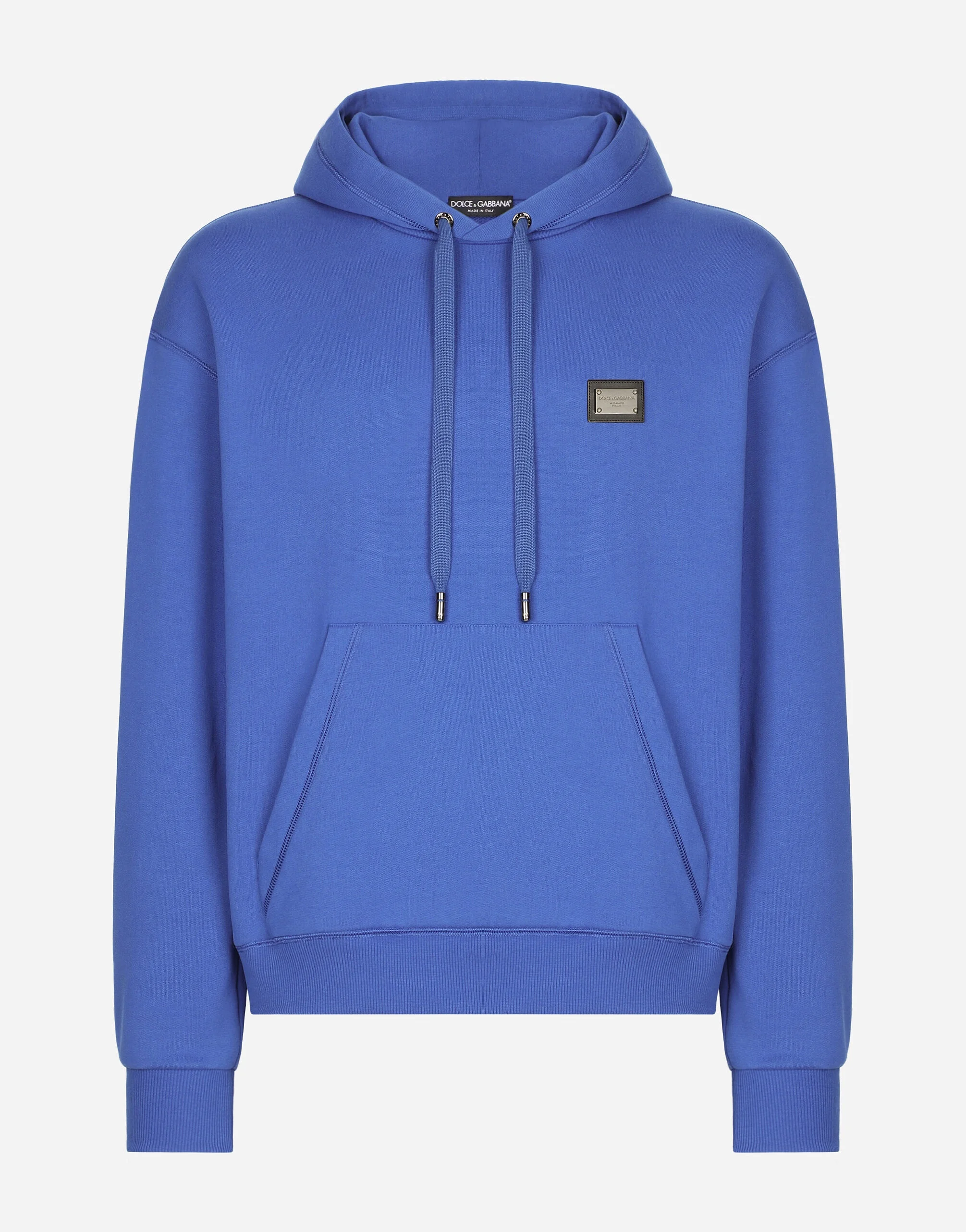 Cotton jersey hoodie with metal tag featuring the Dolce&Gabbana logo: • Blue •Regular fit •Drawstring hood with branded metal aglets •Pouch pocket •Stretch knit hem and cuffs •The piece measures 69 cm from the rear collar seam on a size IT 48 •The model is 185 cm tall and wears a size IT 48 •Made in Italy Care And Details External composition: 100% Cotton