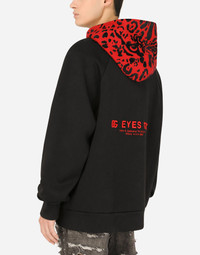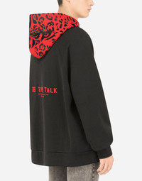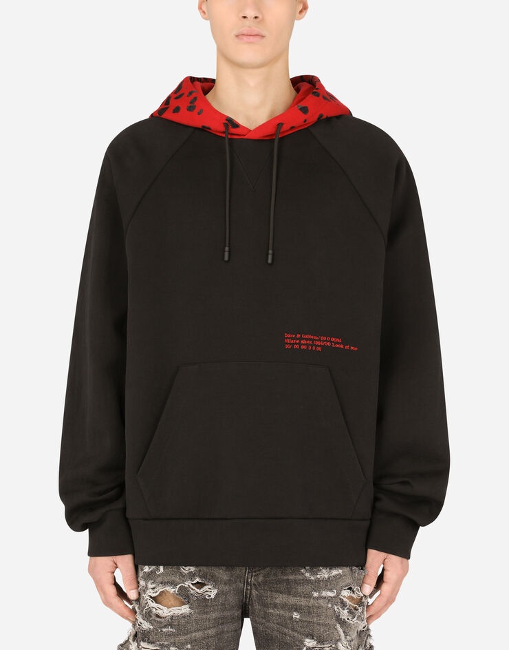 The Hot Animalier collection is built around our iconic Leopard print, which has been updated in red and black hues. New shapes, oversize volumes, red aluminum plating and screen printing create looks for multi-faceted men with a whole lot of personality who know their own minds. Long-sleeved cotton jersey hoodie with contrasting leopard print and embroidery: • Oversize fit • Drawstring hood with flocked leopard print • Pouch pockets • The piece measures 69.5 cm - 27.4 inches from the rear collar seam on a size M • The model is 185 cm - 72.8 inches tall and wears a size M • Made in Italy Care And Details External composition: 93% Cotton 7% Polyamide
