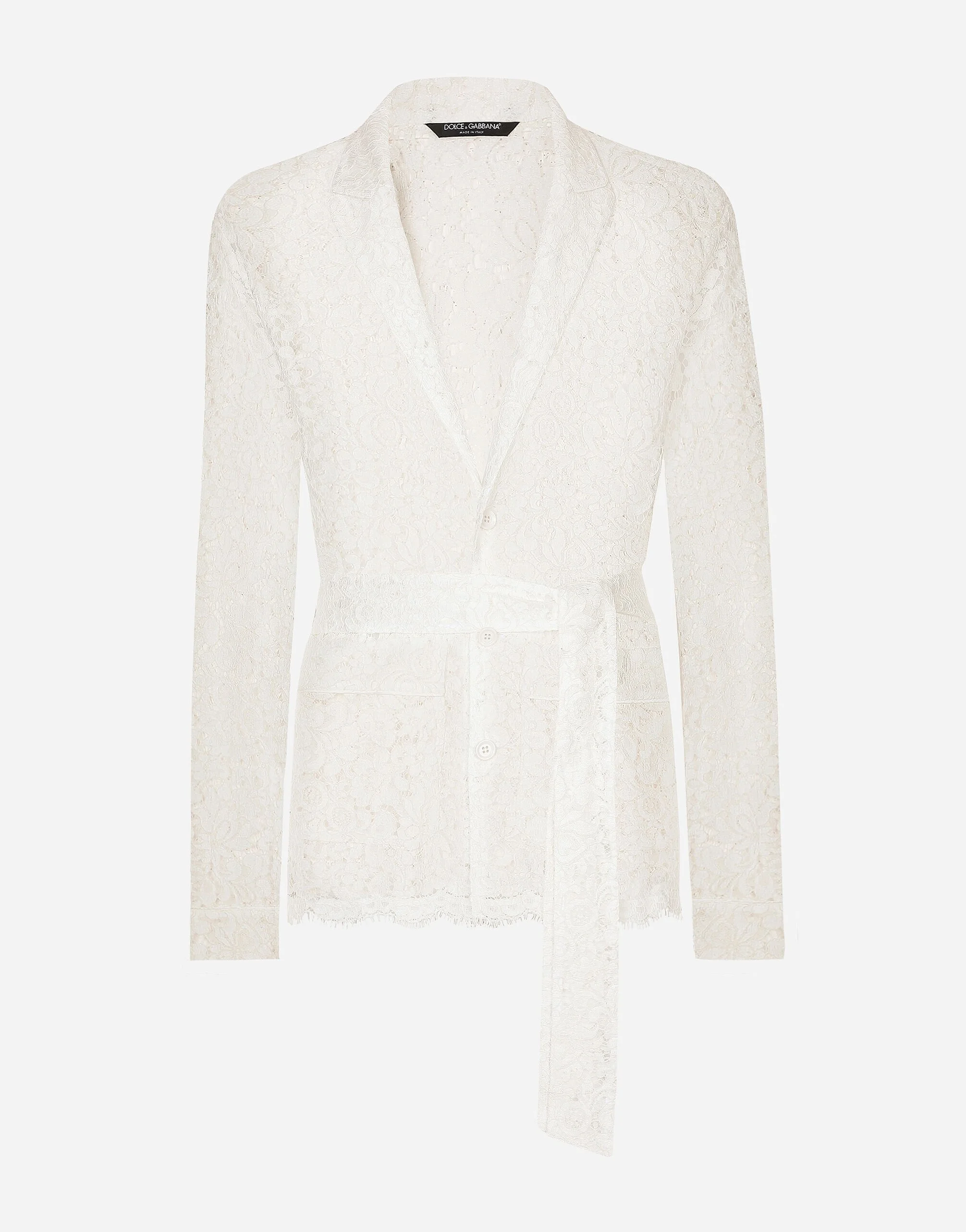 The SS24 “Stile” Collection recounts and clearly presents a strong concept: the unique and unmistakable style of Dolce&Gabbana. A word that is more than a statement. It is a concept! The designers work with surfaces, textures, layers and color nuances, as well as the sheen and fineness of the materials themselves, creating a “Stylish” collection. We’re going back to our roots with the desire to reaffirm the “Stile” - style -, flair and iconic DNA of the brand. Lace robe: • White • Jacket collar • Front patch pockets with tulle lining • Long sleeves • Button fastening and belted waist • Scalloped hem • The piece measures 74.5 cm from the rear collar seam on a size IT 48 • Made in Italy External composition: 54% Viscose 39% Cotton 5% Polyamide 2% Silk