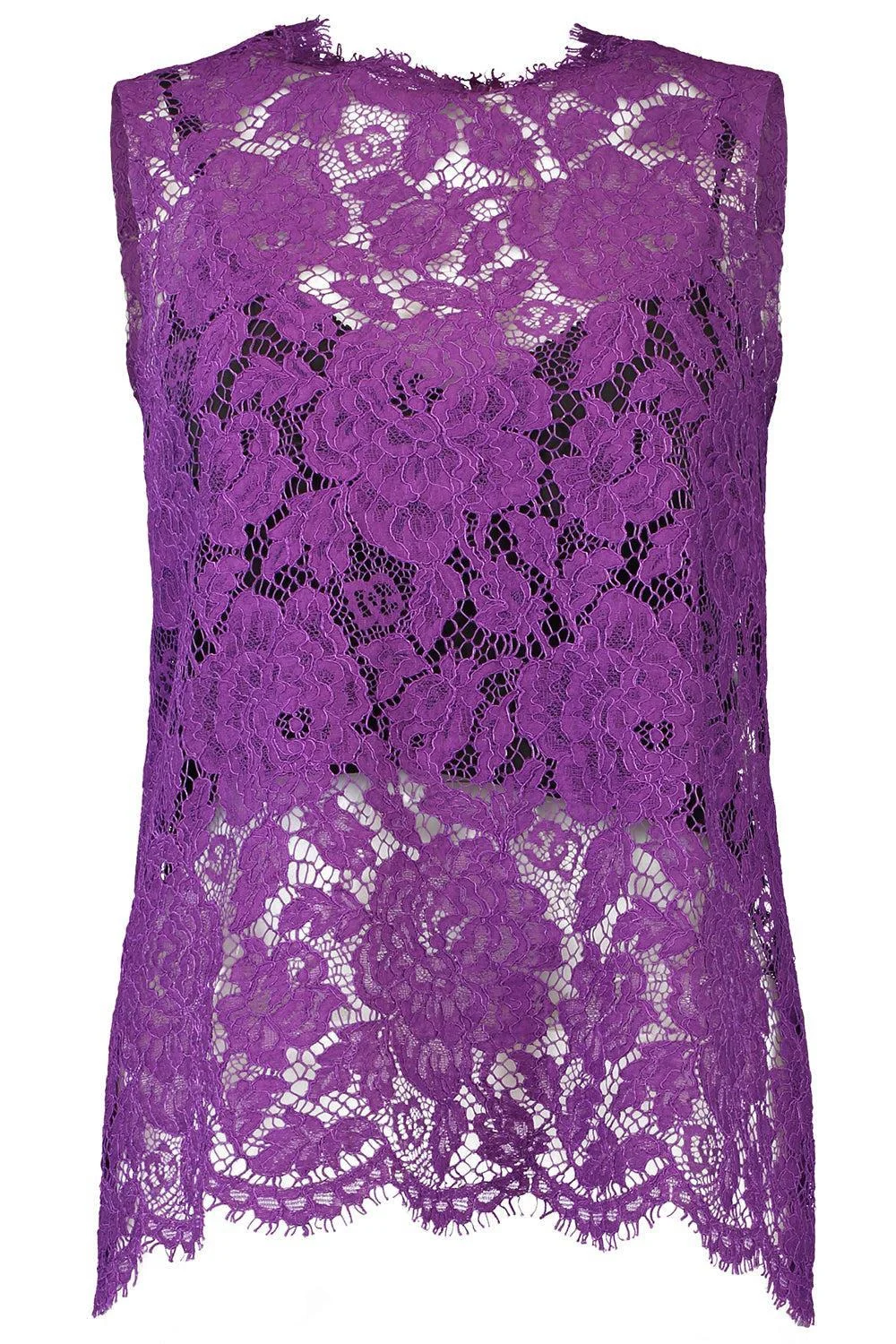 DETAILS AND INSIGHT Dolce & Gabbana lace tank in viola. 35%Cotton+24%Nylon+41%Rayon 09%Spandex+91%Silk Cool Iron / Light Dry Cleaning / No Tumbler Made In Italy Style F73G9T-HLM7L-F0571