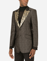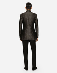 Single-breasted jacket in lamé jacquard with contrasting lapels. • Slim Beat fit • Peak lapels • Double-button fastening on the front • Outer flap pockets and breast pocket, three inner welt pockets • Buttoned cuffs • Side slits • Lined • The piece measures 78 cm - 30.7 inches from the rear collar seam on a size IT 48 • The model is 185 cm - 72.8 inches tall and wears a size IT 48 • Made in Italy Care And Details External composition: 77% Silk 14% Polyester 9% Fiber 9% Metallic Polyester Internal composition: 100% Viscose