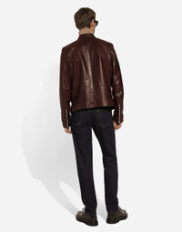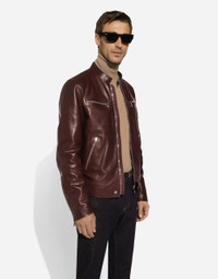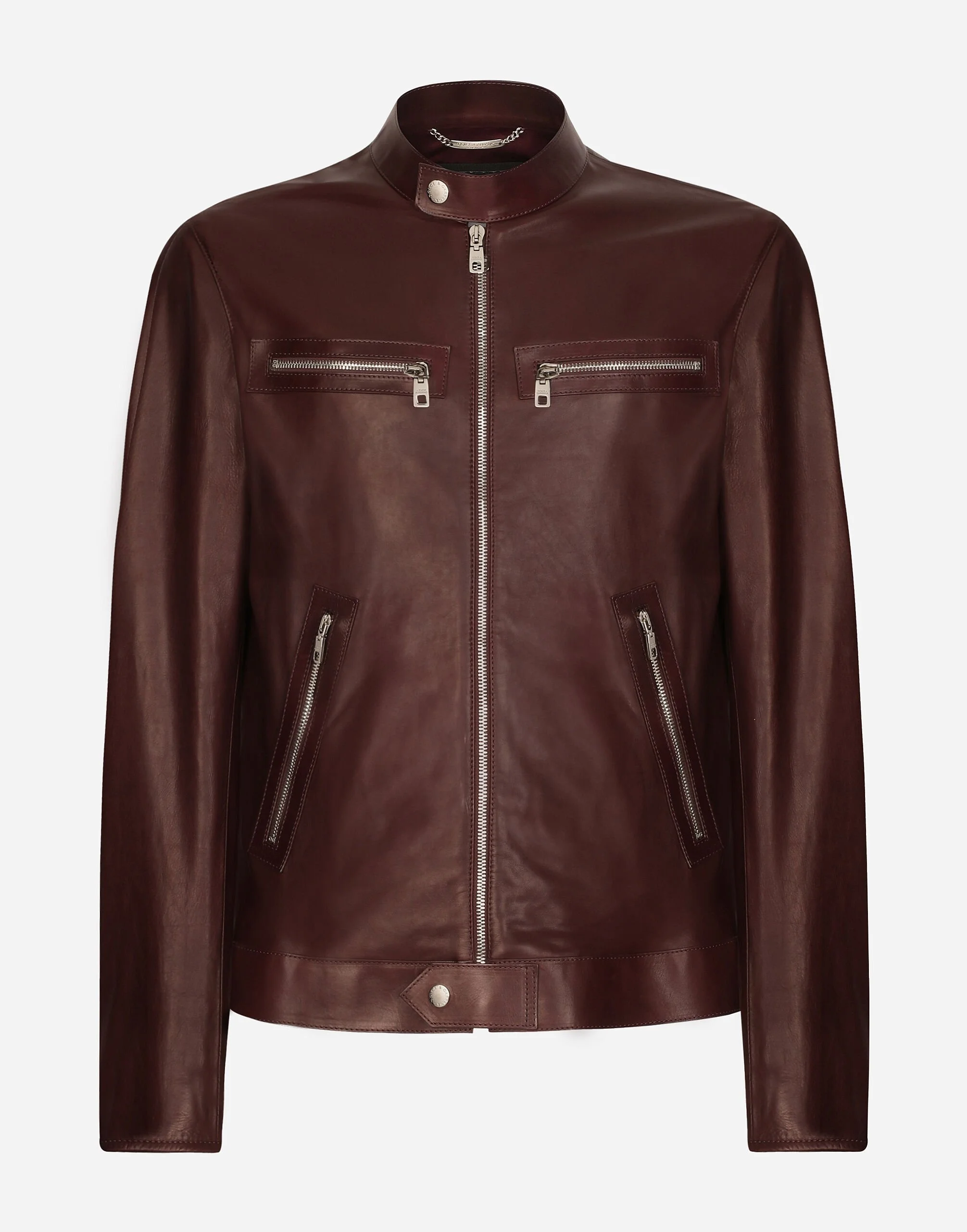 Tailoring means beauty, proportions, skilled cuts and sophisticated details. The FW 24-25 Sartoriale Collection builds on this solid foundation to define new ways of pairing colors, materials and textures. Sicilian rock gray envelops different textures, while Nero Sicilia black adorns textile and velvet weaves and camel pairs with orange. Various types of pinstripes, textured-effect cashmere, double fabrics, suede and denim meet in the looks. Leather jacket: • Brown • Regular fit • Button fastening on collar • Front zipper fastening • Outer patch pockets with exposed zippers and inner welt pockets with button • Lined • The piece measures 64 cm from the rear collar seam on a size IT 48 • Made in Italy External composition: 100% Calfskin Internal composition: 100% Silk