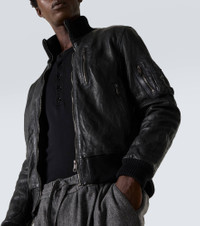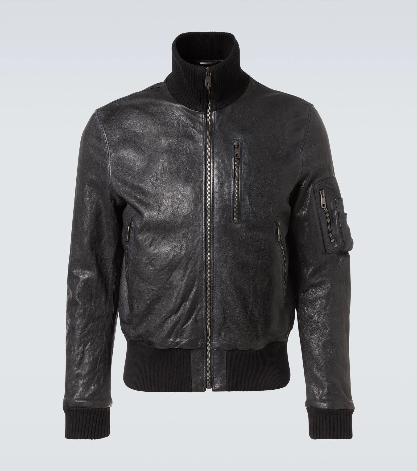 Sicilian culture is at the heart of Dolce&Gabbana's aesthetic, which attributes most of its bold styles to its Italian heritage. This bomber jacket is crafted from aged-effect nappa leather with ribbed trims and a turtleneck. Product Details - Material: 100% sheep leather - Care instructions: specialist clean - Made in Italy - Designer color name: Nero - Item color: black - Lining: 100% viscose - Filling: 100% polyester - Trim: 96% cotton, 4% elastane - Collar: turtleneck - Closure: zipped front - Pockets: zipped pockets, sleeve pocket, internal pockets - Cuff: ribbed - Hem: ribbed - Fully lined - Item number: P01077018 Size & Fit - Fits small to size - we recommend trying one size larger - Straight fit - Elasticated hem - Non-stretchy fabric - Height of model is 192cm-75.5" and wears a size IT 52