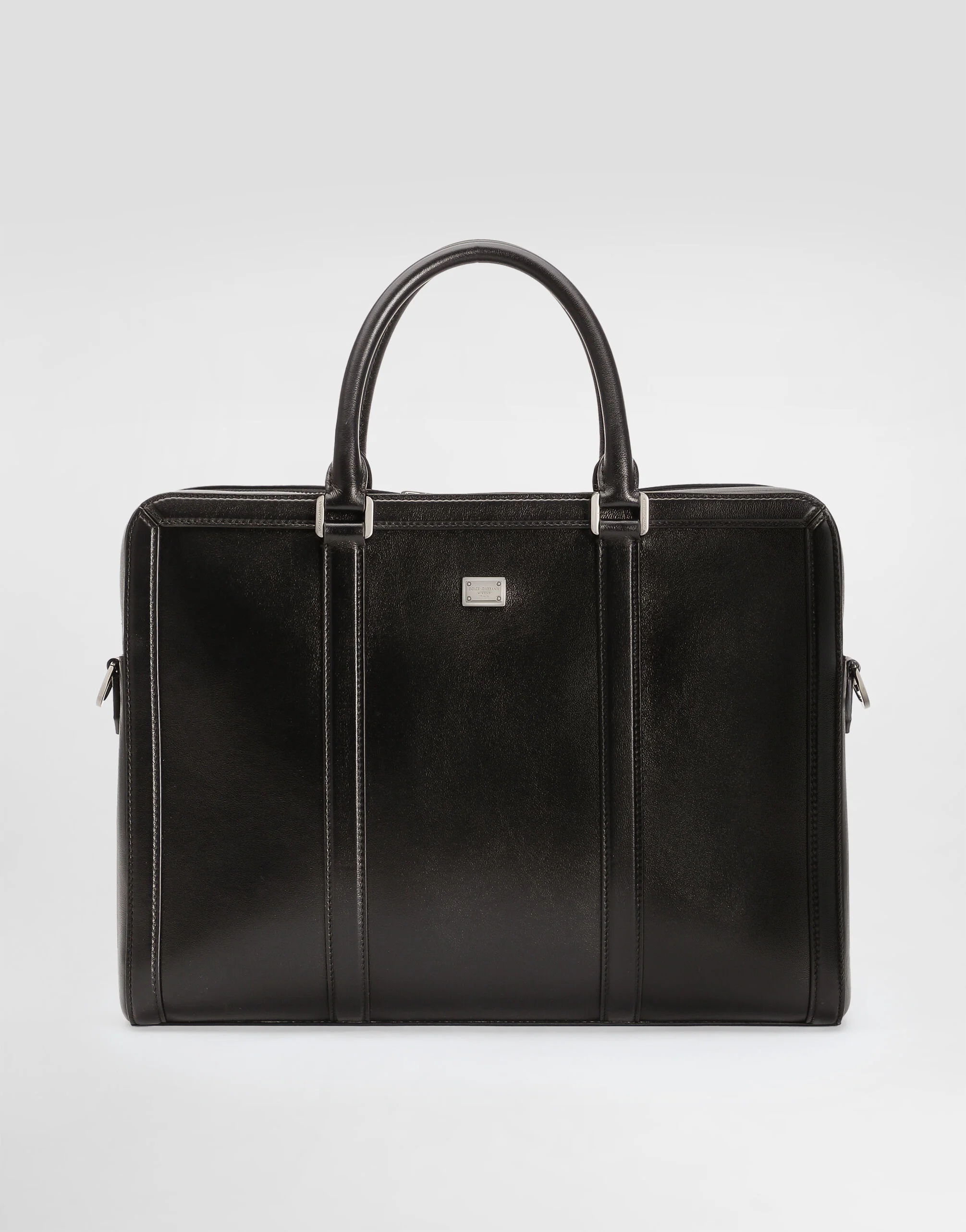 Practical and spacious, this new calfskin briefcase features a ruthenium-plated branded tag. Calfskin briefcase: • Black • Branded tag in ruthenium-plated metal • Top fastening with double zipper and slider with logo • Calfskin top handles • Adjustable and detachable crossbody strap • Fabric lining with zipped pocket and flat pocket • Item comes with a branded dust bag • Measurements: H27.5 x W37.5 x D7 • Made in Italy External composition: 100% Calfskin Internal composition: 70% Cotton 20% Acrylic 10% Calfskin