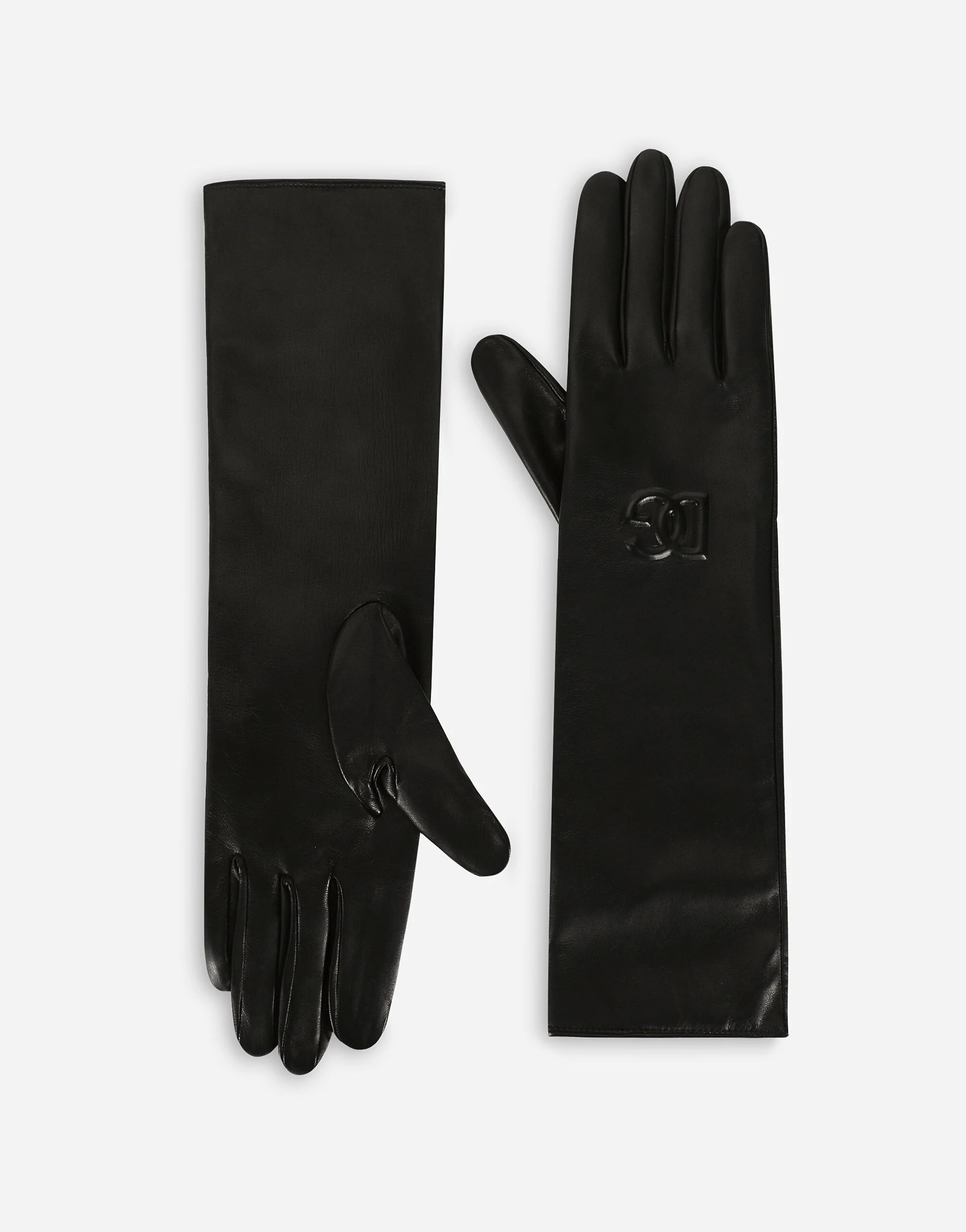These long gloves come in glove-quality nappa leather. Featuring a silk lining, they are embellished by the DG logo created with the high-frequency technique, which gives it a 3D look. Long nappa leather gloves with DG logo: • Black • Silk lining • Item comes with a branded dust bag • Measurements: H43 x W0 x D0 cm • Made in Italy External composition: 100% Lambskin Internal composition: 100% Silk