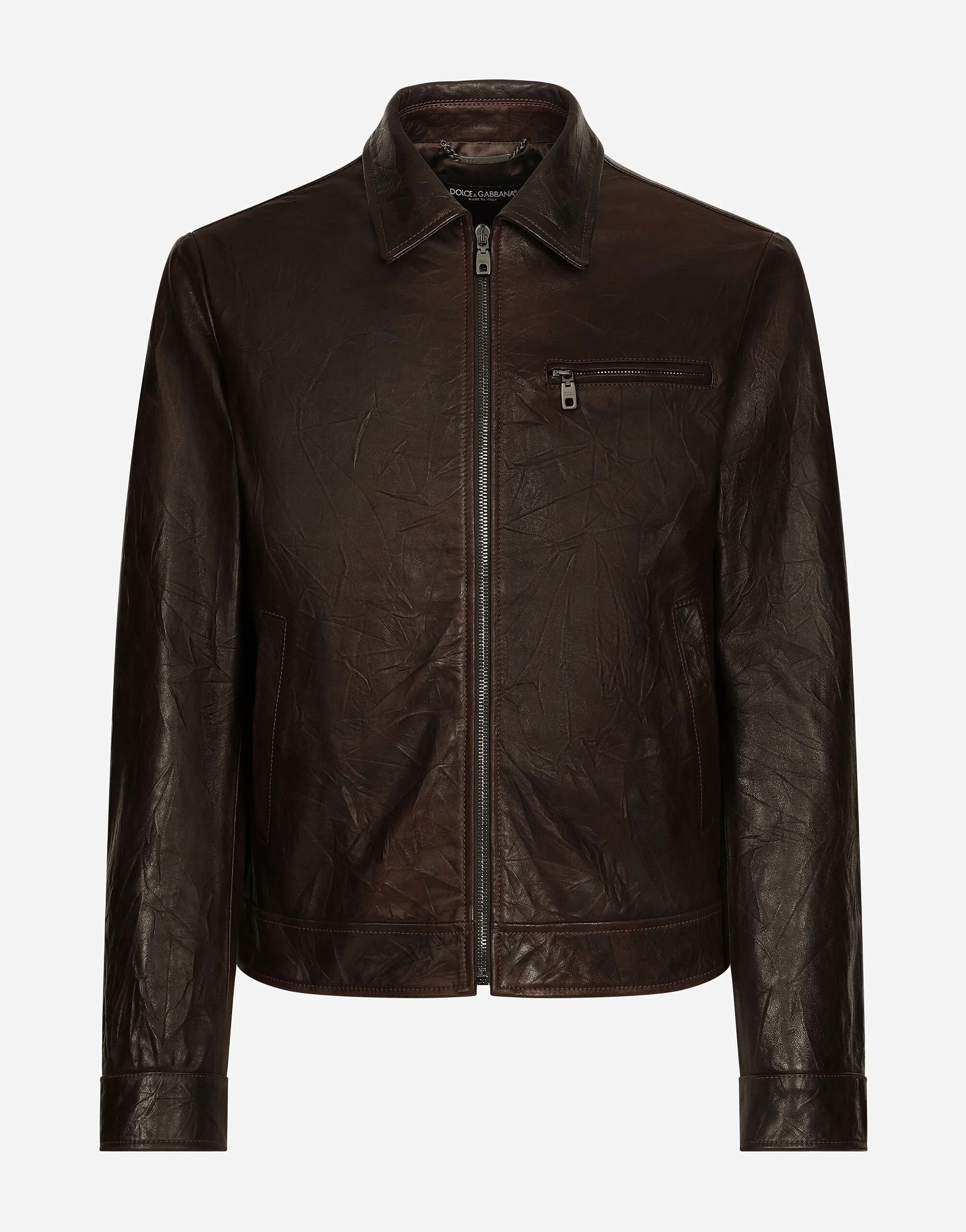The Palermo collection represents the link between the Sicilian man’s world and the unspoiled nature of the island. A language marked by warm hues - sand, cream, Nero Sicilia black - floral paintings and iconic prints.The Dolce&Gabbana closet must-haves have been reworked in different materials, in pursuit of a new form of harmony. A collection rich in suggestion, such as the stripes inspired by the old mattresses of the 1940s and 1950s, and the timeless aesthetic of the looks. Crushed-look leather jacket: • Brown • Slim fit • Shirt collar • Front zipper fastening • Welt side pockets with button and zipped breast pocket • Lined • The piece measures 72 cm from the rear collar seam on a size IT 48 • Made in Italy External composition: 100% Sheepskin Internal composition: 100% Silk