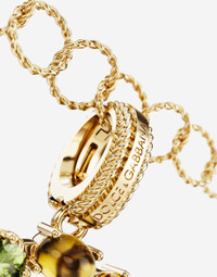 The charm is illuminated by beautiful natural gems, such as topazes, garnets, amethysts, citrines, peridots, tourmalines, and beryls: the countless shades of their colors, dominated by blue, green, purple, red, pink, and yellow, evoke the warm and sunny atmospheres of Sicily. The different shapes and various cuts of the crystals are also emphasized by the settings, which alternate twisted wire work and smooth surfaces. Light reflects and refracts on the facets of the gems and the gold in a always surprising way, maximizing the brilliance of the charms. Technical features: Gold 750/000. Gems: 1 square cushion blue "Sky" topaz, 1 drop blue "London" topaz, 1 oval dark purple amethyst, 1 oval cabochon orange-red hessonite garnet, 1 drop intense yellow citrine, 1 oval cabochon yellow citrine, 1 round green tourmaline, 1 oval green/yellow peridot. Made in Italy. Complete the look with the twisted wire chain in yellow gold and create your favorite word. For a better fit, we recommend a distance of 5 empty rings between the pendants. Yellow 18 kt Gold