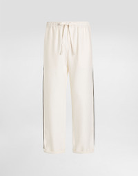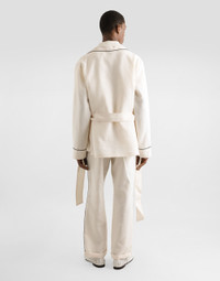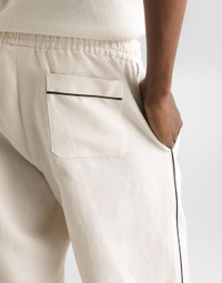 Italy and its beauty are reflected in the Men’s SS25 Collection. Woven raffia and leather give life to jackets, polo-shirts and sweaters to celebrating Italian craftsmanship. The color palette ranges from Nero Sicilia black to burgundy, contributing to conveying a sense of eternal elegance. Refined accessories complement the look: belts and loafers with hand-finished details and oversize bags, such as the Sicily, the Marlene with crocodile-effect print and the versatile Adamo tote. Linen fabric pajama pants: • White • Regular fit • Stretch waistband with drawstring • Contrasting piping • Front slant pockets and patch back pockets • The item measures 103 cm on the outer leg and the hem is 25 cm wide on a size IT 48 • Made in Italy External composition: 100% Linen