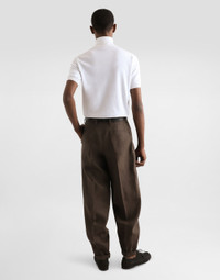 Italy and its beauty are reflected in the Men’s SS25 Collection. Woven raffia and leather give life to jackets, polo-shirts and sweaters to celebrating Italian craftsmanship. The color palette ranges from Nero Sicilia black to burgundy, contributing to conveying a sense of eternal elegance. Refined accessories complement the look: belts and loafers with hand-finished details and oversize bags, such as the Sicily, the Marlene with crocodile-effect print and the versatile Adamo tote. Classic linen fabric pants: • Brown • Regular fit • Belt loops on the waist • Fly-covered zipper and button fastening • Front slant pockets and welt back pockets • The item measures 100 cm on the outer leg and the hem is 18 cm wide on a size IT 48 • Made in Italy External composition: 100% Linen
