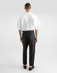 Italy and its beauty are reflected in the Men’s SS25 Collection. Woven raffia and leather give life to jackets, polo-shirts and sweaters to celebrating Italian craftsmanship. The color palette ranges from Nero Sicilia black to burgundy, contributing to conveying a sense of eternal elegance. Refined accessories complement the look: belts and loafers with hand-finished details and oversize bags, such as the Sicily, the Marlene with crocodile-effect print and the versatile Adamo tote. Linen shirt with full sleeves: • White • Oversize fit • Kent collar • Short sleeves • Button fastenings • The piece measures 80.5 cm from the rear collar seam on a size IT 41 • Made in Italy External composition: 100% Linen