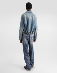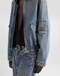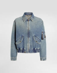 The Italian Holiday Men's Collection revisits 1950s style with a blend of relaxed fits and modern flair. Classic white shirts and tailored suits in refined fabrics contrast with casual denim and playful T-shirts featuring retro graphics with a futuristic twist. Bold prints—chessboards, cats, elegant lighters, and Mediterranean blue ribbons—alongside logo jacquard inspired by ties, infuse a contemporary edge into the essence of Italian holidays. Cotton denim bomber jacket with metal tag and the Dolce&Gabbana logo: • Blue • Oversize fit • Front zipper and stretch waistband • Buttoned pockets and a zipped bellow pocket on the sleeve • The piece measures 63 cm from the rear collar seam on a size IT 48 • Made in Italy External composition: 100% Cotton