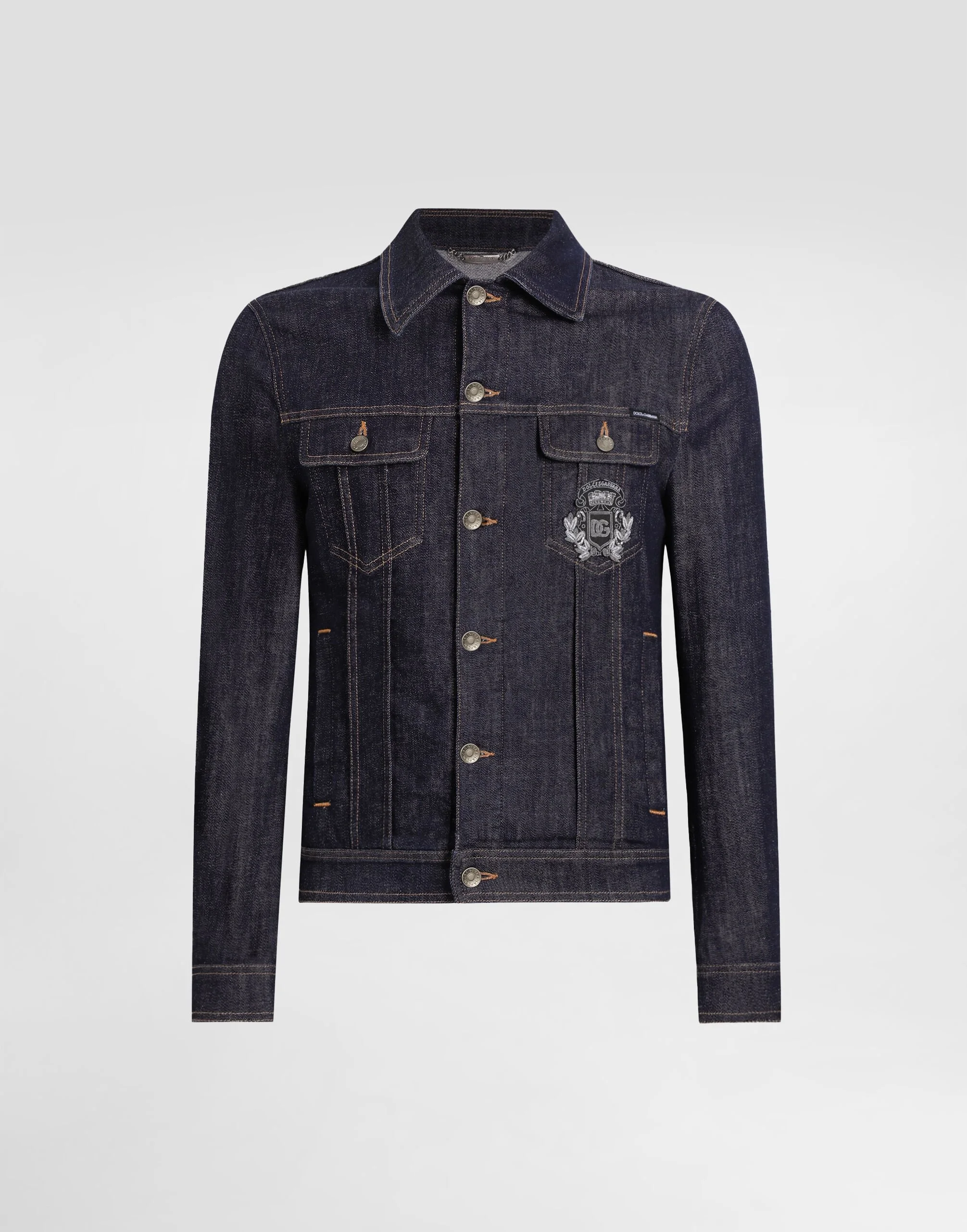 The Italian Holiday Men's Collection revisits 1950s style with a blend of relaxed fits and modern flair. Classic white shirts and tailored suits in refined fabrics contrast with casual denim and playful T-shirts featuring retro graphics with a futuristic twist. Bold prints—chessboards, cats, elegant lighters, and Mediterranean blue ribbons—alongside logo jacquard inspired by ties, infuse a contemporary edge into the essence of Italian holidays. Cotton denim jacket with heraldic emblem: • Blue • Slim fit • Branded metal buttons on the front • Pockets with buttons and Dolce&Gabbana logo label • The piece measures 60 cm from the rear collar seam on a size IT 48 • Made in Italy External composition: 98% Cotton 2% Spandex
