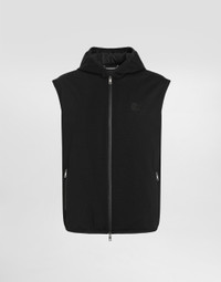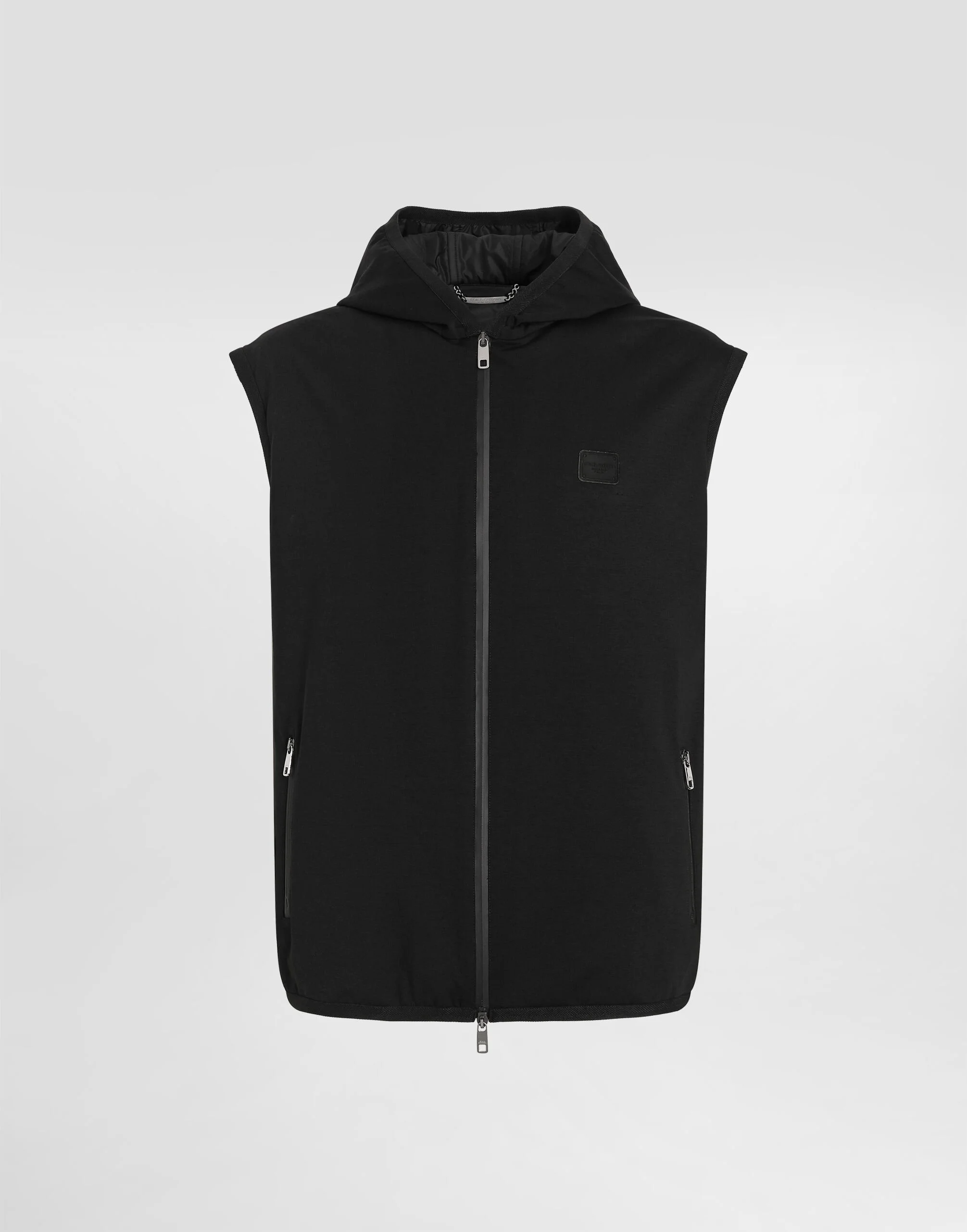 The Italian Holiday Men's Collection revisits 1950s style with a blend of relaxed fits and modern flair. Classic white shirts and tailored suits in refined fabrics contrast with casual denim and playful T-shirts featuring retro graphics with a futuristic twist. Bold prints—chessboards, cats, elegant lighters, and Mediterranean blue ribbons—alongside logo jacquard inspired by ties, infuse a contemporary edge into the essence of Italian holidays. Technical fabric vest with hood: • Black • Regular fit • Zipper fastening • Front welt pockets and two inner pockets • TRAVEL label • Lined • The piece measures 78 cm from the rear collar seam on a size IT 48 • Made in Italy External composition: 52% Cotton 40% Polyamide 8% Spandex Internal composition: 100% Polyester